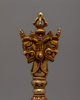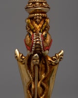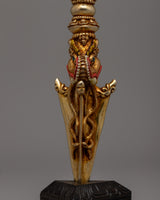 With the help of our magnificent Tibetan Buddhist Phurba, discover the deep secrets of Tibetan Buddhism. This sacred ritual item is made entirely of copper, carefully crafted by hand with devotion, and lavishly plated in gold, which stands for enlightenment and purity. With a height of 31.5 cm, it is a powerful focal point for spiritual activities that demands respect and attention.
