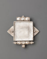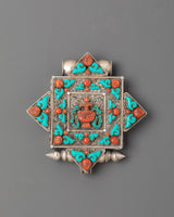 This Ghau Locket with Coral is a beautifully handcrafted silver locket, accented with vibrant coral and turquoise stones. Measuring 10.5cm in height and 10cm in width, it is designed as a sacred container for spiritual items, prayers, or small relics, making it an essential piece for altars or ritual practices.