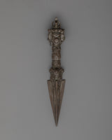The ceremonial dagger (Kila in Sanskrit; Phurba in Tibetan) is crucial for banishing evil and is thought to be especially useful in squelching the forces that obstruct Tantric Buddhist meditation. Its earliest known usage was as the core blade of the vajra that Indra used to kill the first cosmic serpent, Vritra, in the Hindu Rg Veda. It was undoubtedly related to Vedic sacrifices because the Sanskrit word for it, Kila, implies stake or peg. By meditation on the Vajrakila Tantr, an ancient Indian scripture that was first spread in Tibet in the eighth century by Padmasambhava, one of the founding gurus of Tibetan Buddhism, the three-headed Vajrakila Buddha is evoked.