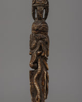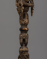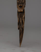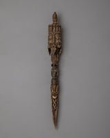 Tibetan Phurba Knife is a powerful ceremonial tool and an eye-catching ornamental item that is perfect for collectors, art enthusiasts, and spiritual practitioners. Its profound spiritual symbolism and artistic beauty enhance any space as it promotes thoughtful reflection and devotion. This phurba is a valued addition to any collection or sacred space since it is more than just a pretty ornament. It is an important artifact that represents fine craftsmanship and profound spiritual ideals.