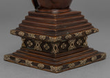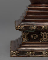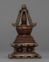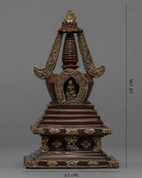 This beautifully crafted stupa is a handmade masterpiece created with exquisite attention to detail by skilled artisans. Made with a Silver plated finish, it features an intricately designed statue that is crafted onto the bumpa. The stupa symbolizes enlightenment and peace, and its elegant design and silver finish make it an excellent addition to any home or meditation space. The statue on the bhumpa adds an extra layer of spiritual significance to this already remarkable piece. This stupa is a perfect way to bring a sense of calm and tranquility to any environment.