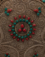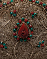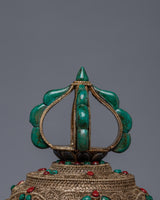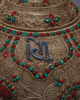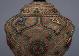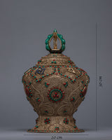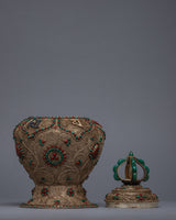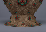 This Tibetan rice pot is a lovely art made from a copper body. It is intricately designed and has gemstones inlaid on its exterior. The pot is embellished with a handcrafted mantra, which adds to its spiritual significance. The rice pot is both an artistic masterpiece and a functional item that can be used in daily life. Its craftsmanship and beauty make it an excellent addition to any home and an ideal gift for loved ones.