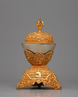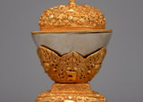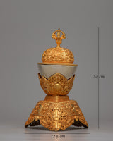The magnificent Tibetan Ritual Kapala immerses you in Tibetan ritual's ancient traditions. This ceremonial vase, handcrafted with dedication on a copper body, is embellished with brilliant 24K gold and silver plating that exudes divine majesty and reverence. Every component of this masterwork is precisely constructed, transporting practitioners to a world of spiritual connection and ceremonial dedication.