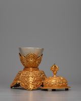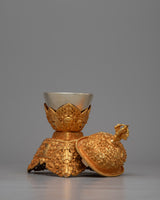 The Kapala set holds the nectar used for performing higher esoteric rituals. It offers liberation to gods and deities to ensure their devotion. It is said that the offerings will be transformed into the Wisdom Nectar, a liquid form of the Enlightened Mind of the Deity.
