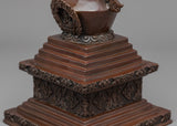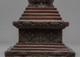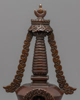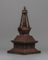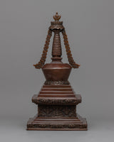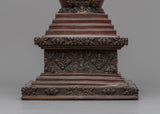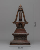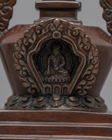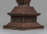 A Tibetan Chorten Stupa is a religious structure depicting the Buddha's enlightened mind and the journey to enlightenment. This stupa stands 12.2 inches tall and is carved on an oxidized Copper body. It has a square foundation and a dome-shaped structure on top, representing the five pure elements of earth, water, fire, air, and space. Intricate carvings and engravings represent different Buddhist symbols and chants on the stupa. Circumambulating a stupa while reciting mantras is thought to help one acquire merit and purify negative karma.