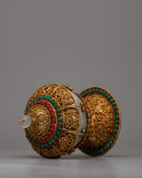 Presenting the Tibetan Traditional Bowl Rice Pot, a stunning blend of fine craftsmanship and cultural history. This gorgeous bowl is handcrafted with a copper body and tastefully electroplated in gold. It is embellished with crystal, turquoise, and coral. It weighs 1.068 kg and measures 18.5 cm in height by 12.5 cm in breadth.