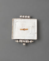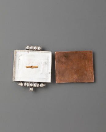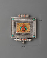 This Tibetan Treasure Vase Ghau Box Locket is a striking example of traditional Tibetan artistry. Crafted from high-quality silver, this locket showcases a stunning vase motif at its center, symbolizing the Treasure Vase, a representation of endless abundance and prosperity. The intricate gold design surrounding the vase adds a rich and detailed touch, capturing the essence of Tibetan spirituality. Surrounding the central motif are carefully set semi-precious stones, including turquoise and coral, that enhance the piece's beauty and significance.