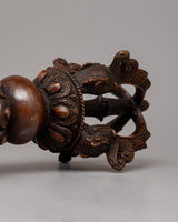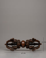 The Tibetan Vajra Dorje allows you to immerse yourself in ancient Tibetan spiritual understanding. Handmade with painstaking care on an oxidized copper body, this sacred instrument has a solid body that radiates strength and longevity. It stands 11 cm tall, 30 cm wide, and weighs 4.78 kg, making it an interesting focus point in your spiritual practice.