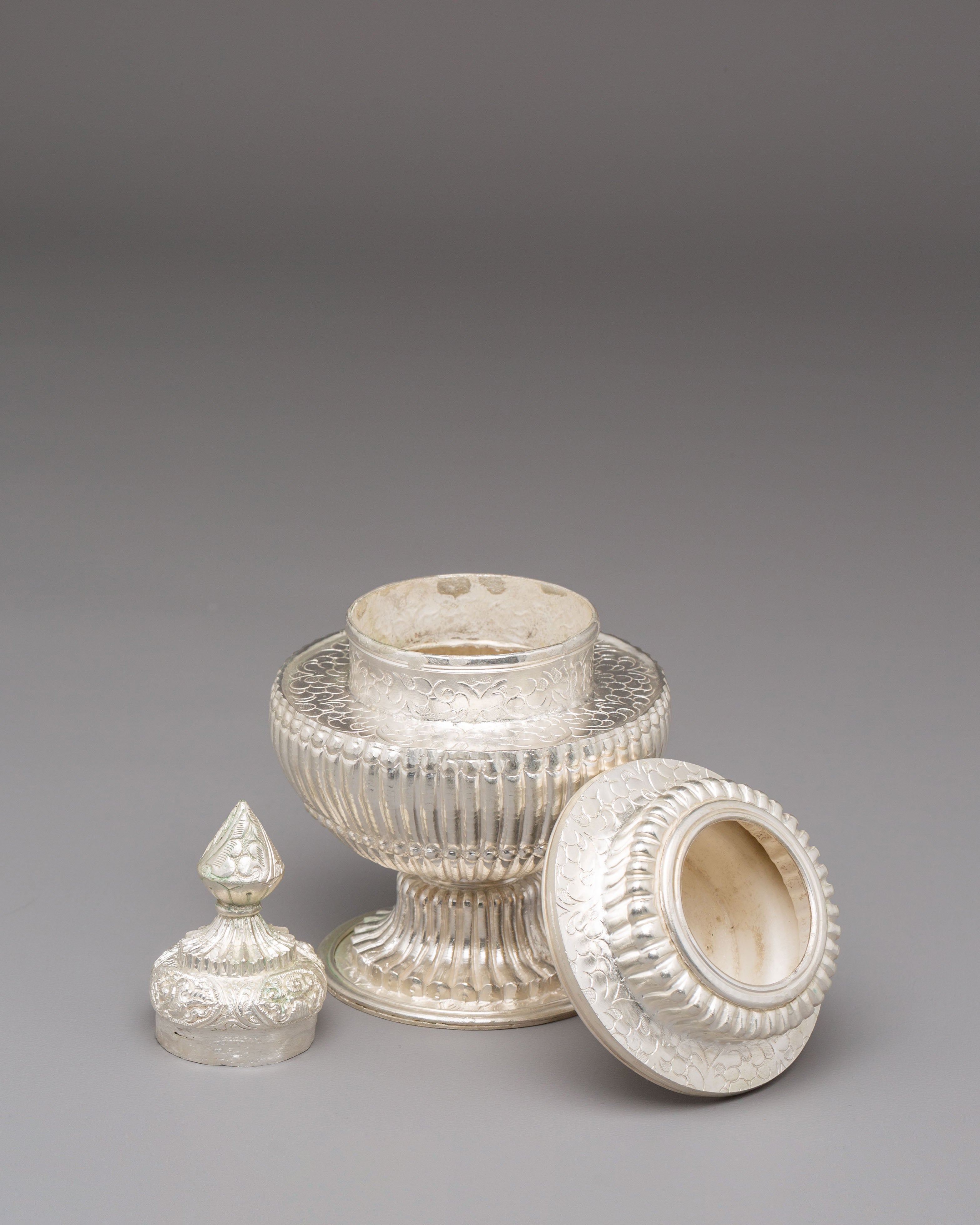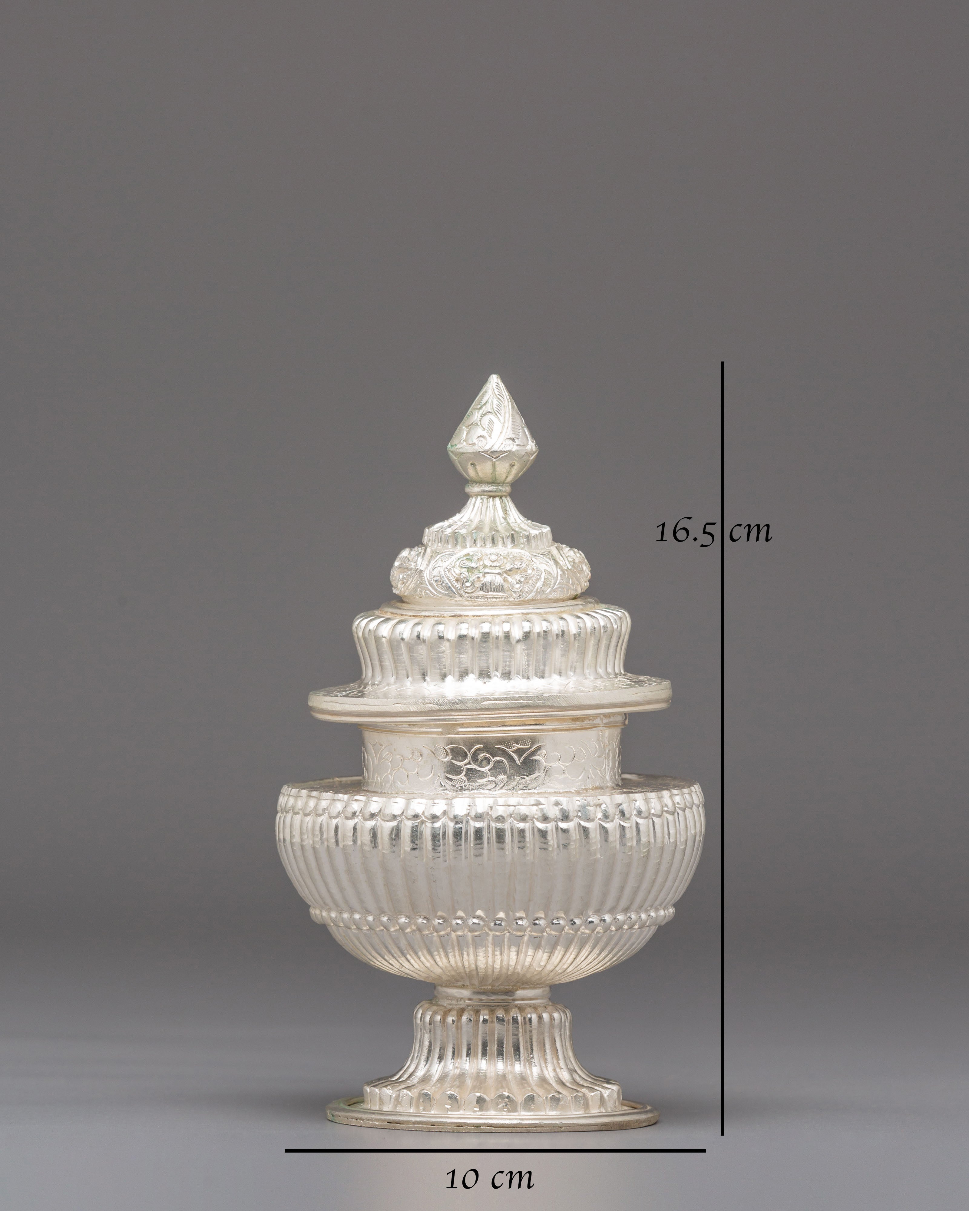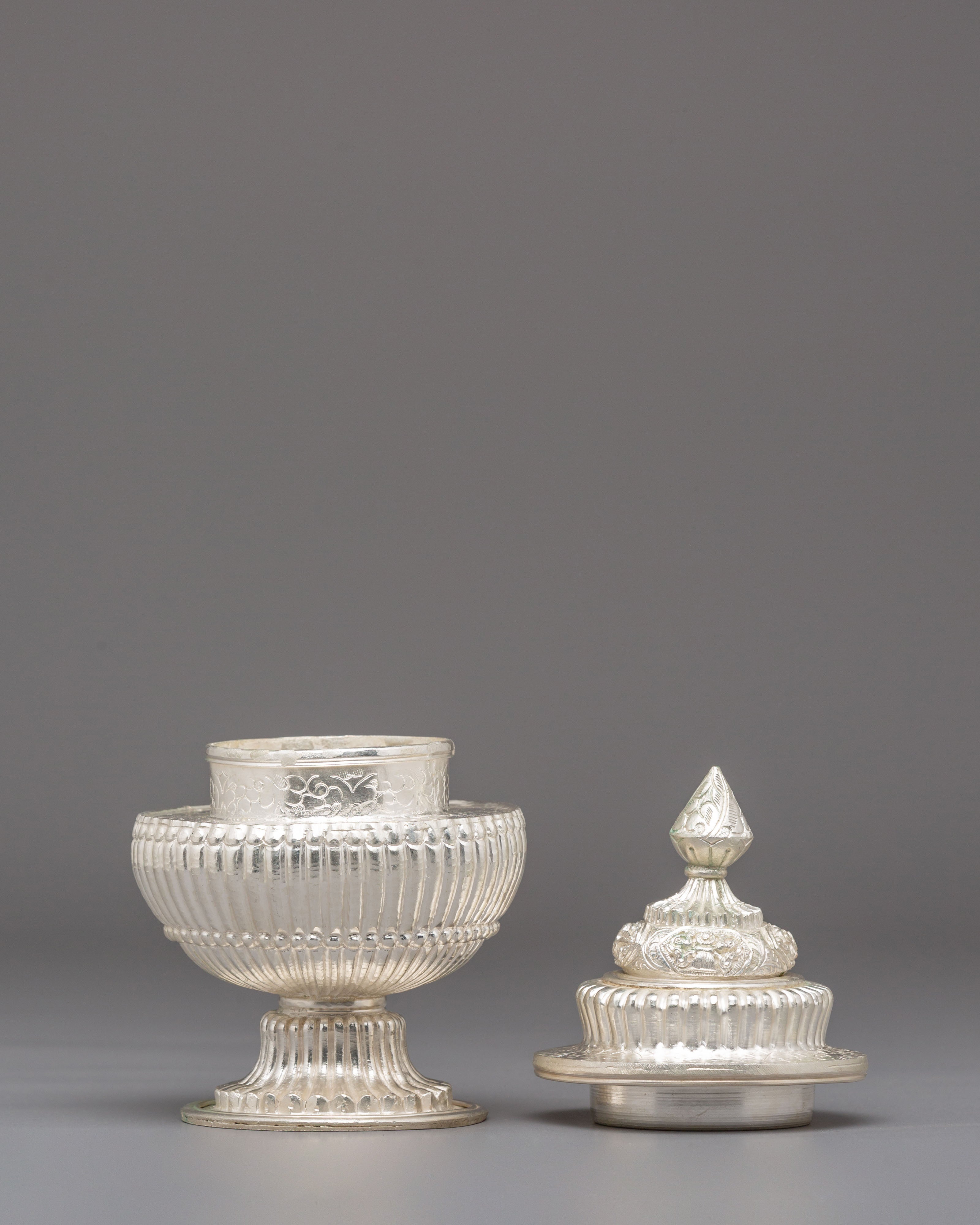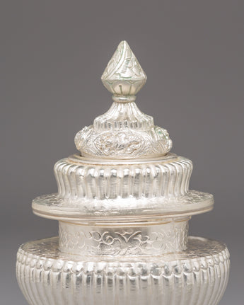Used in Buddhist and Hindu ceremonies, this ritual rice pot symbolizes abundance, gratitude, and the act of offering devotion to the divine. Traditionally, it is filled with rice, grains, or water—representing prosperity and the continuity of life. The silver plating enhances its sacred significance, reflecting inner peace and spiritual clarity. Every detail of this copper vessel embodies cultural heritage, transforming ordinary rituals into moments of reflection and connection with higher consciousness.