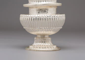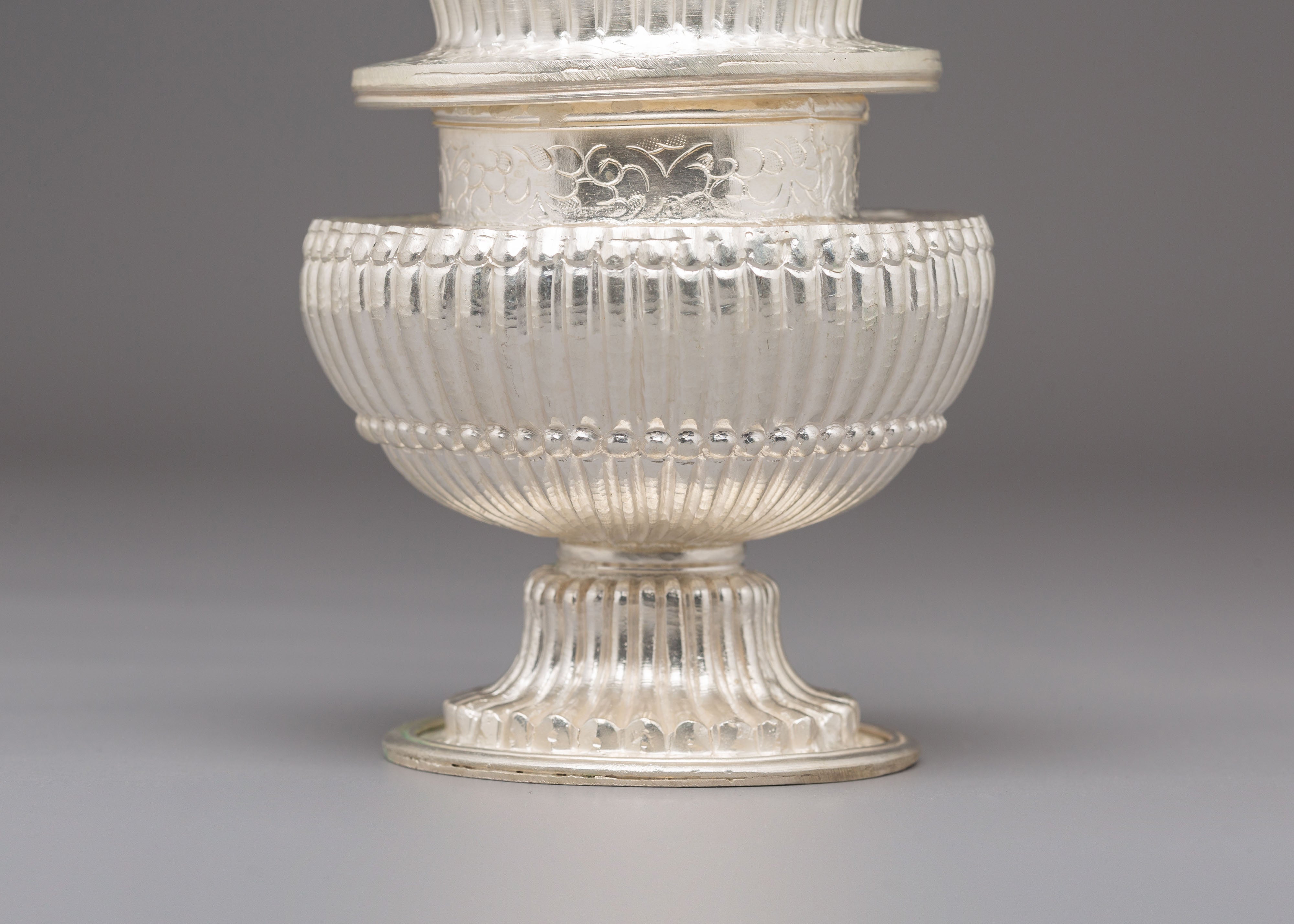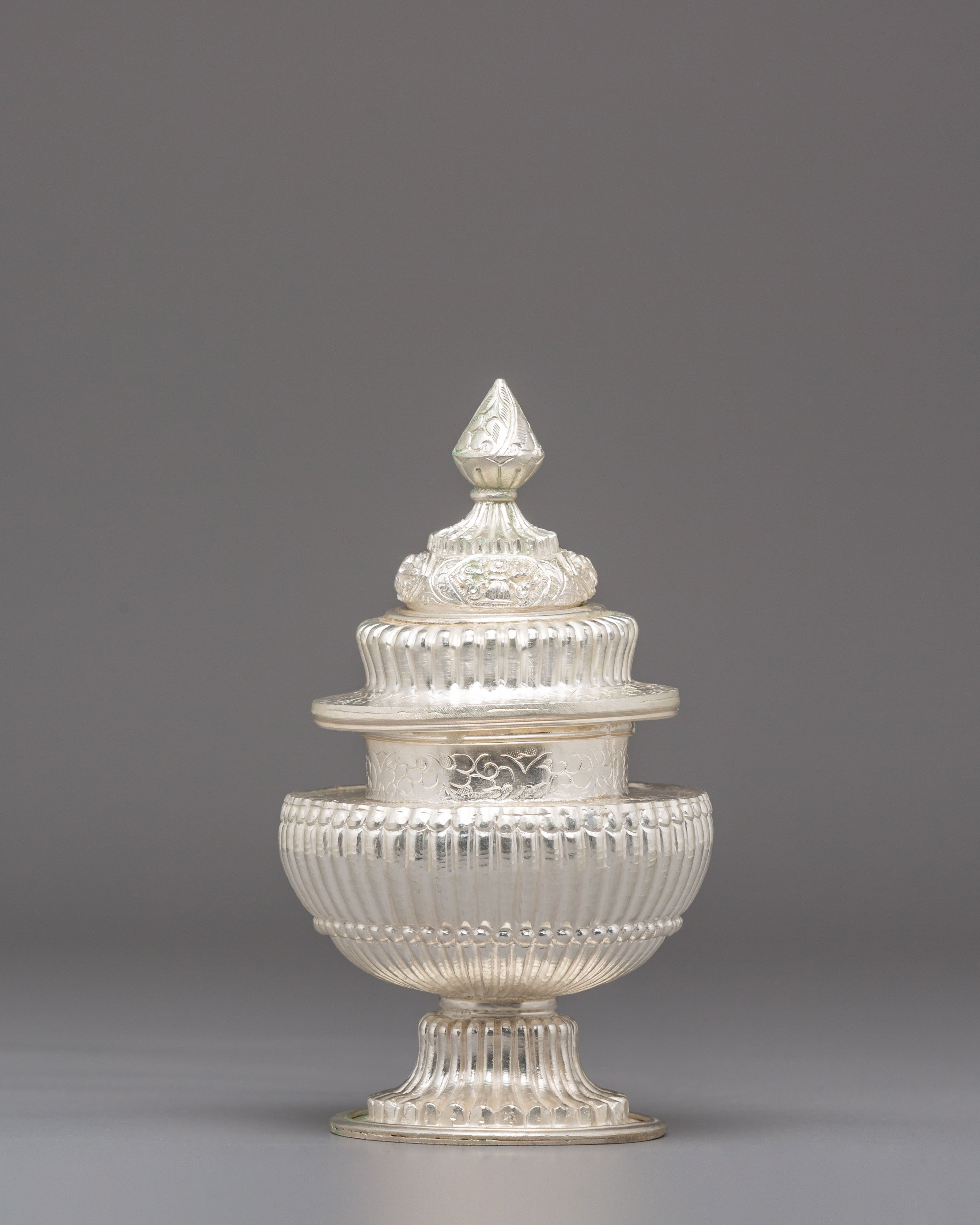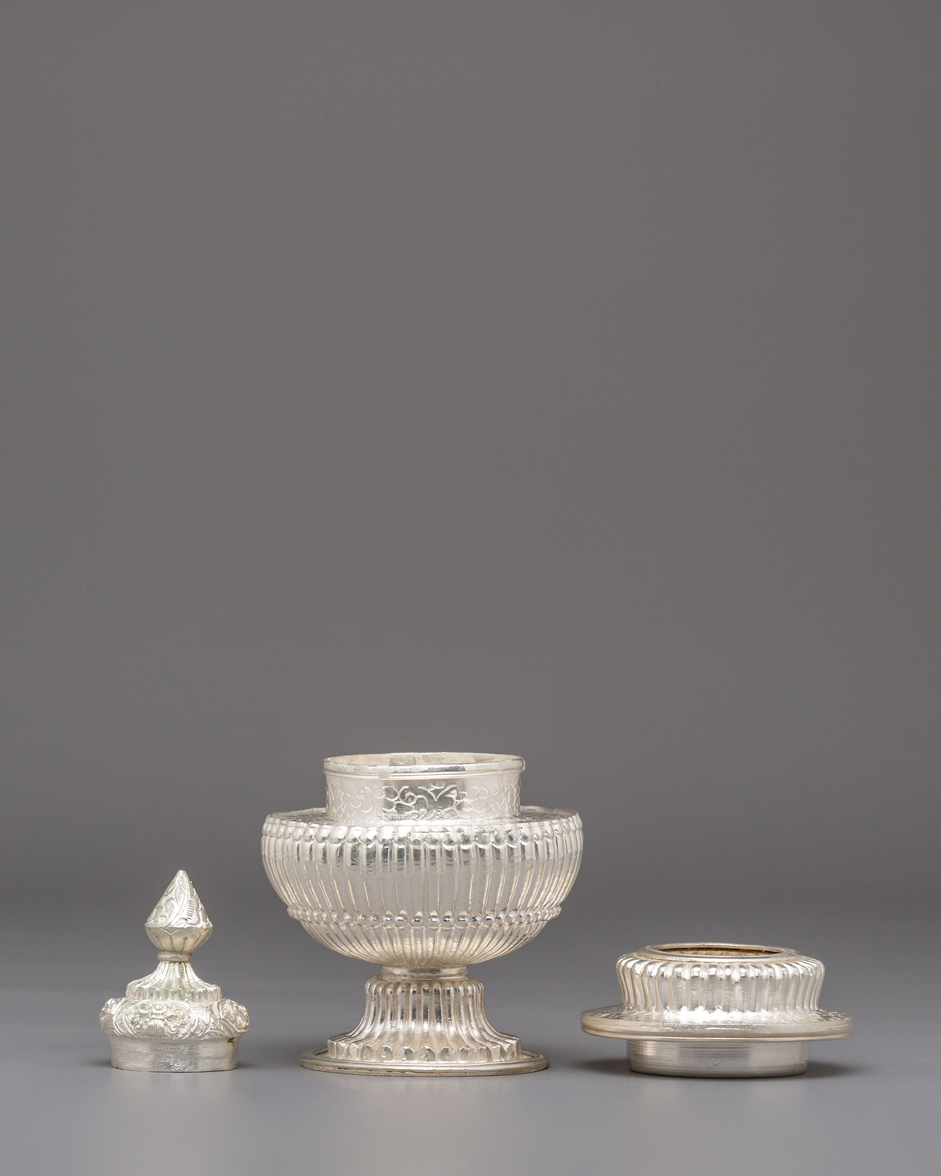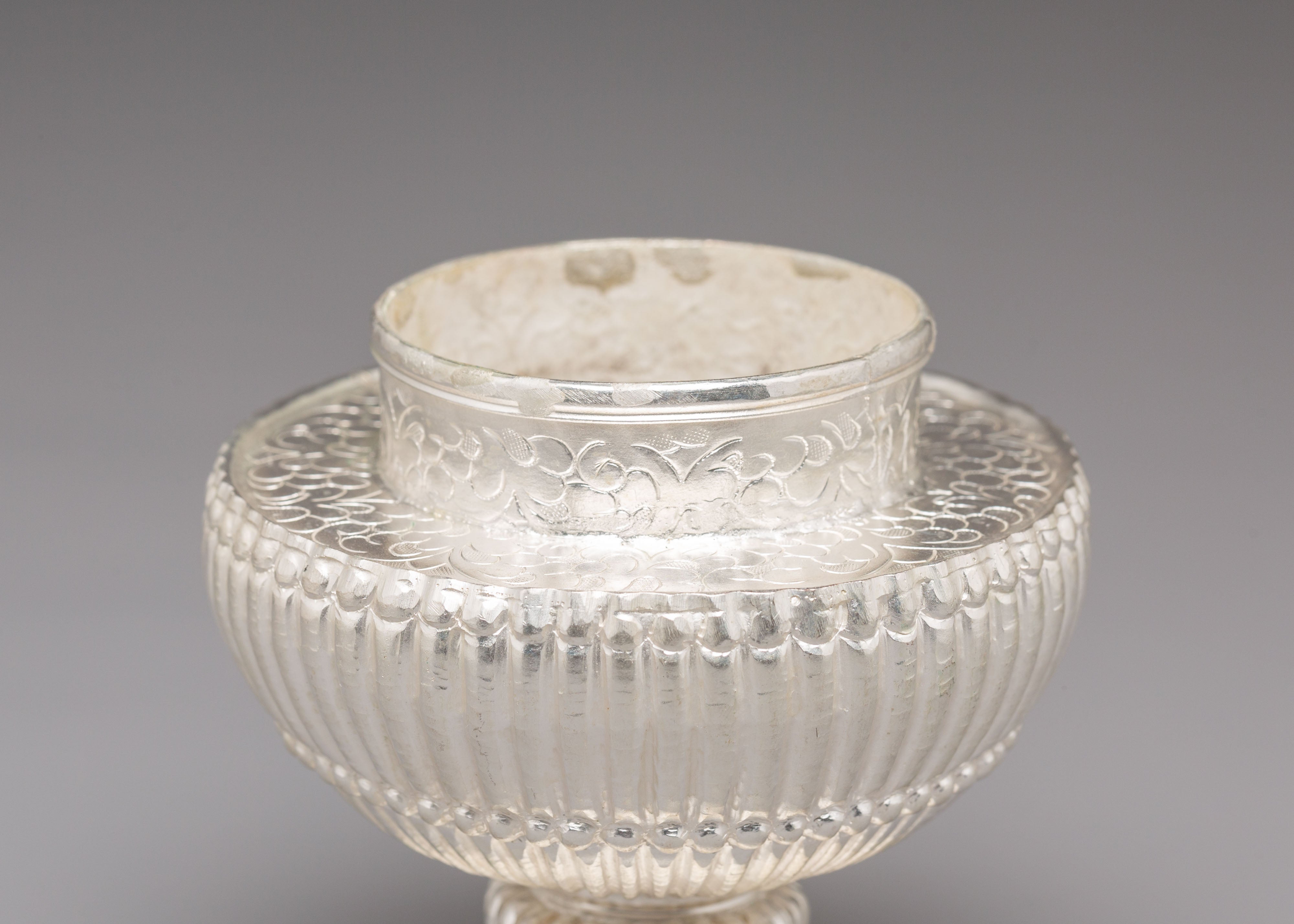 Used in Buddhist and Hindu ceremonies, this ritual rice pot symbolizes abundance, gratitude, and the act of offering devotion to the divine. Traditionally, it is filled with rice, grains, or water—representing prosperity and the continuity of life. The silver plating enhances its sacred significance, reflecting inner peace and spiritual clarity. Every detail of this copper vessel embodies cultural heritage, transforming ordinary rituals into moments of reflection and connection with higher consciousness.