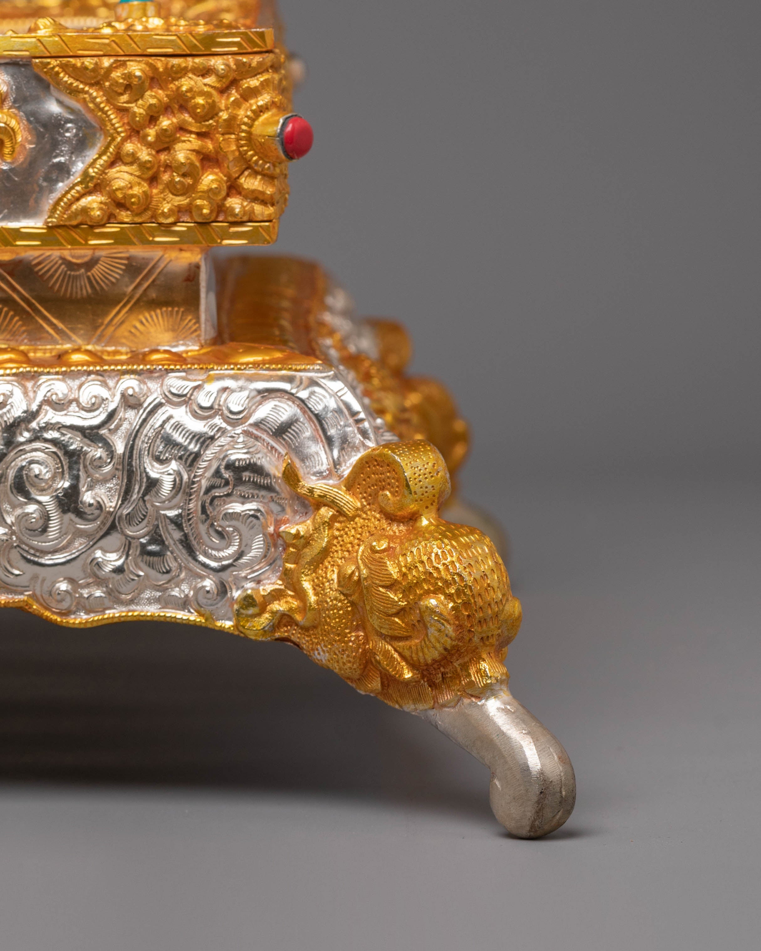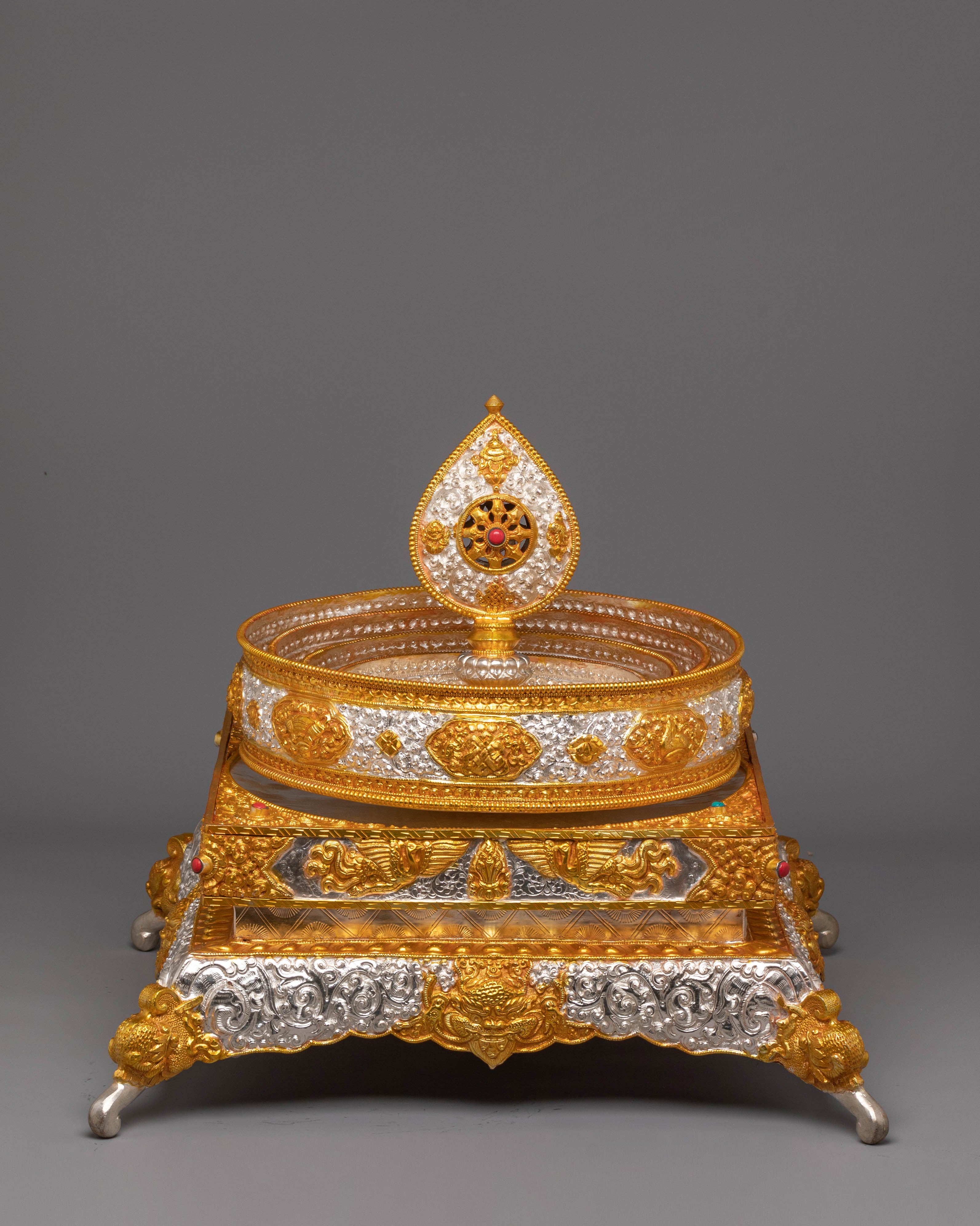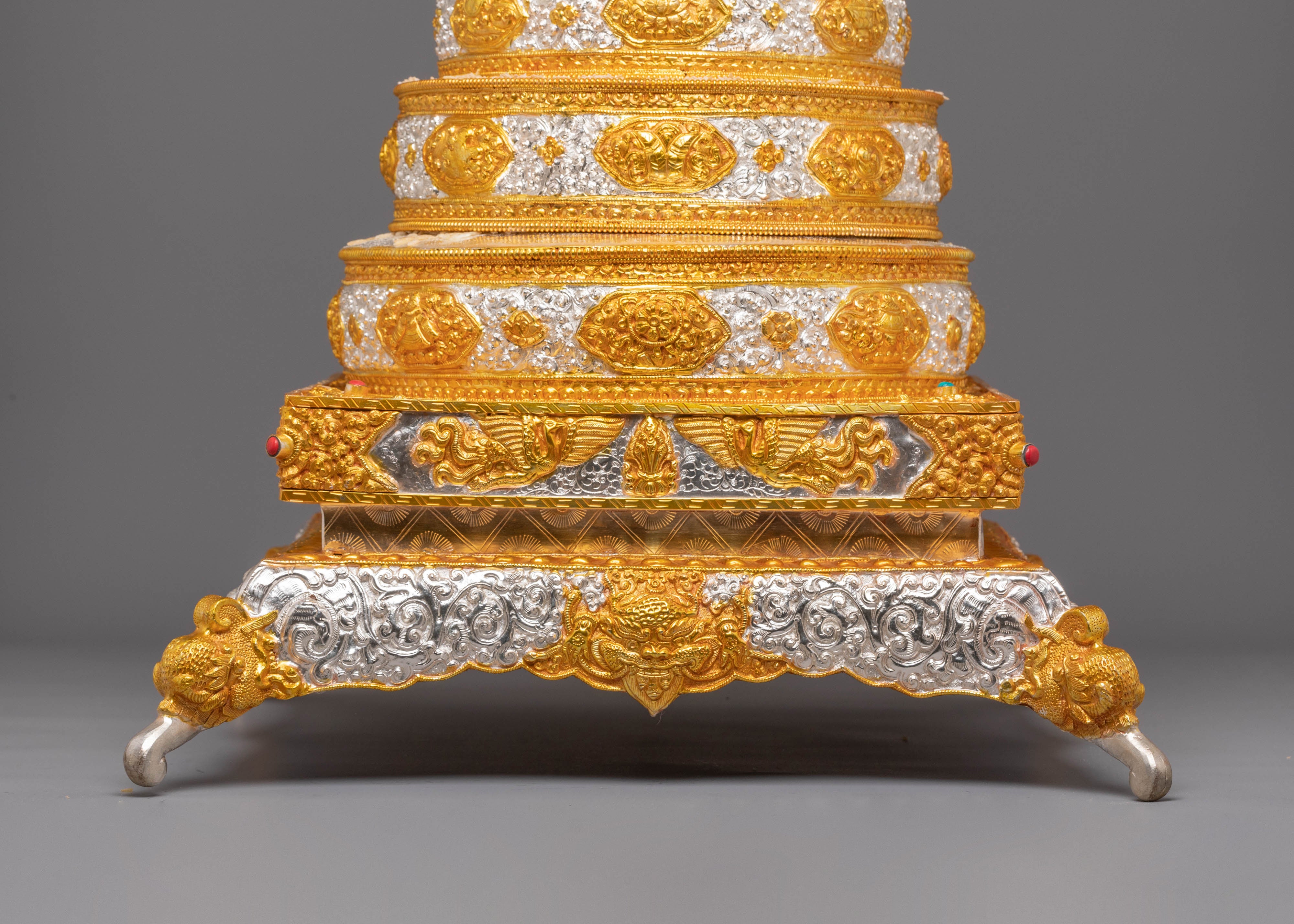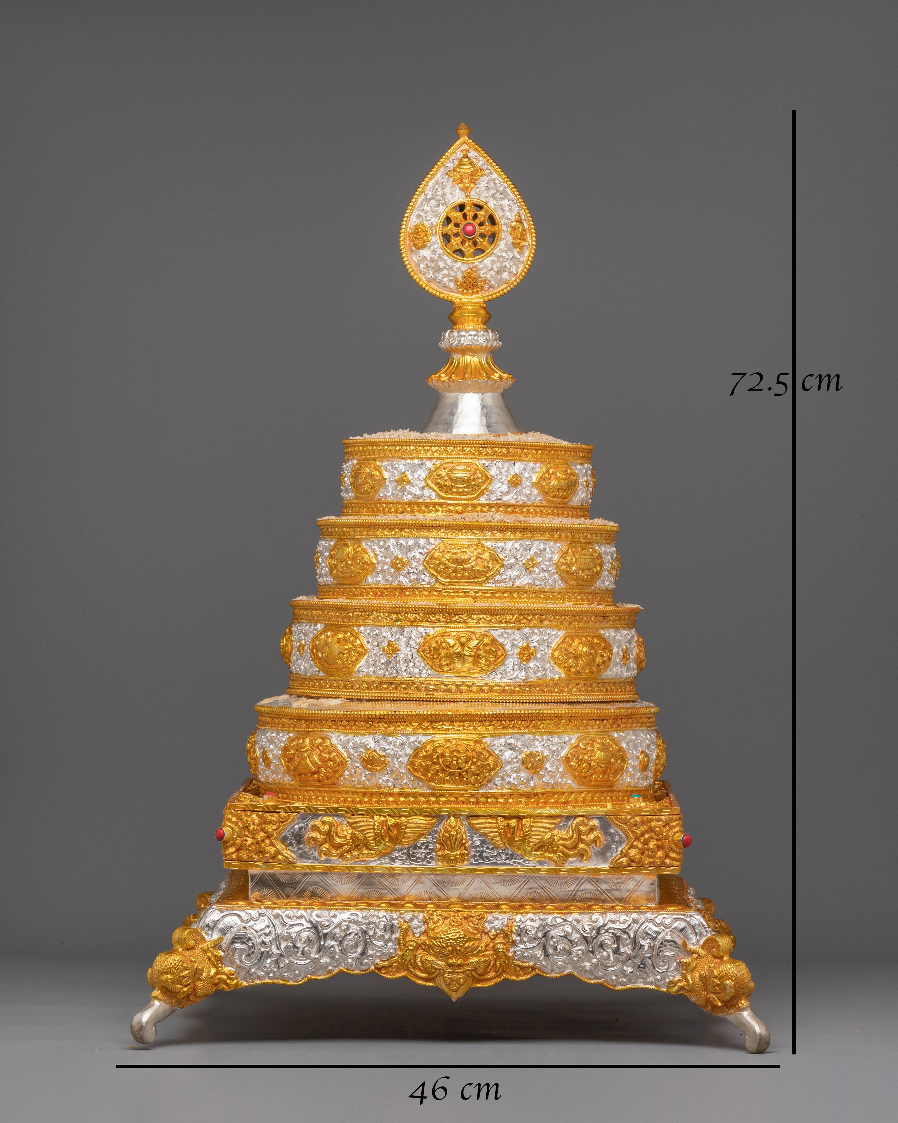 The multi-layered pattern of this mandala represents the journey of spiritual awakening, with each level symbolizing a different stage of enlightenment. The gold-plated layers reflect purity and heavenly light, whereas the silver-plated parts promote clarity and balance. Coral and turquoise stones represent vitality, protection, and spiritual clarity. The elaborate workmanship around the base and above the mandala's crown exemplifies traditional Tibetan craftsmanship, adding spiritual vitality and artistic depth to any area.