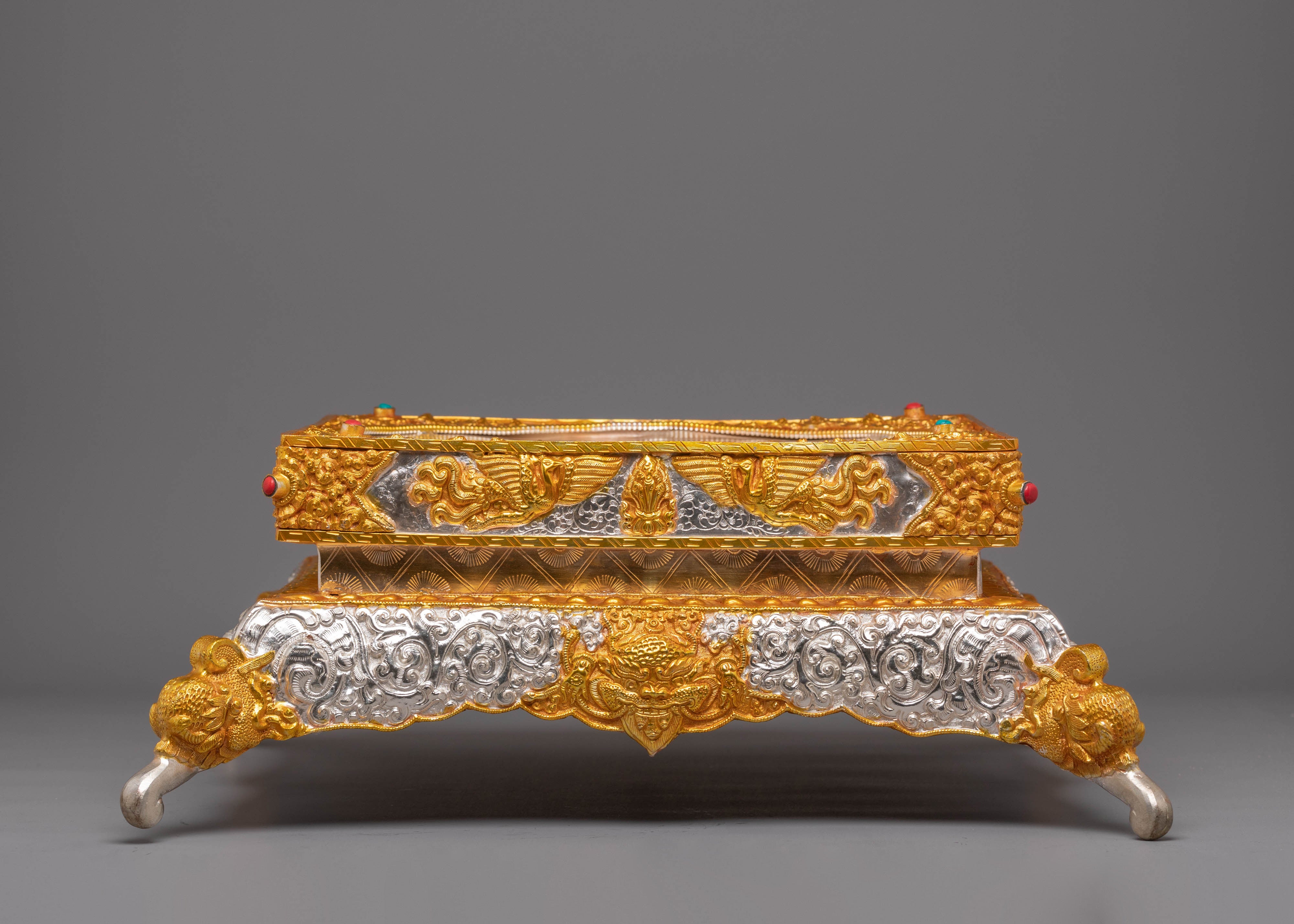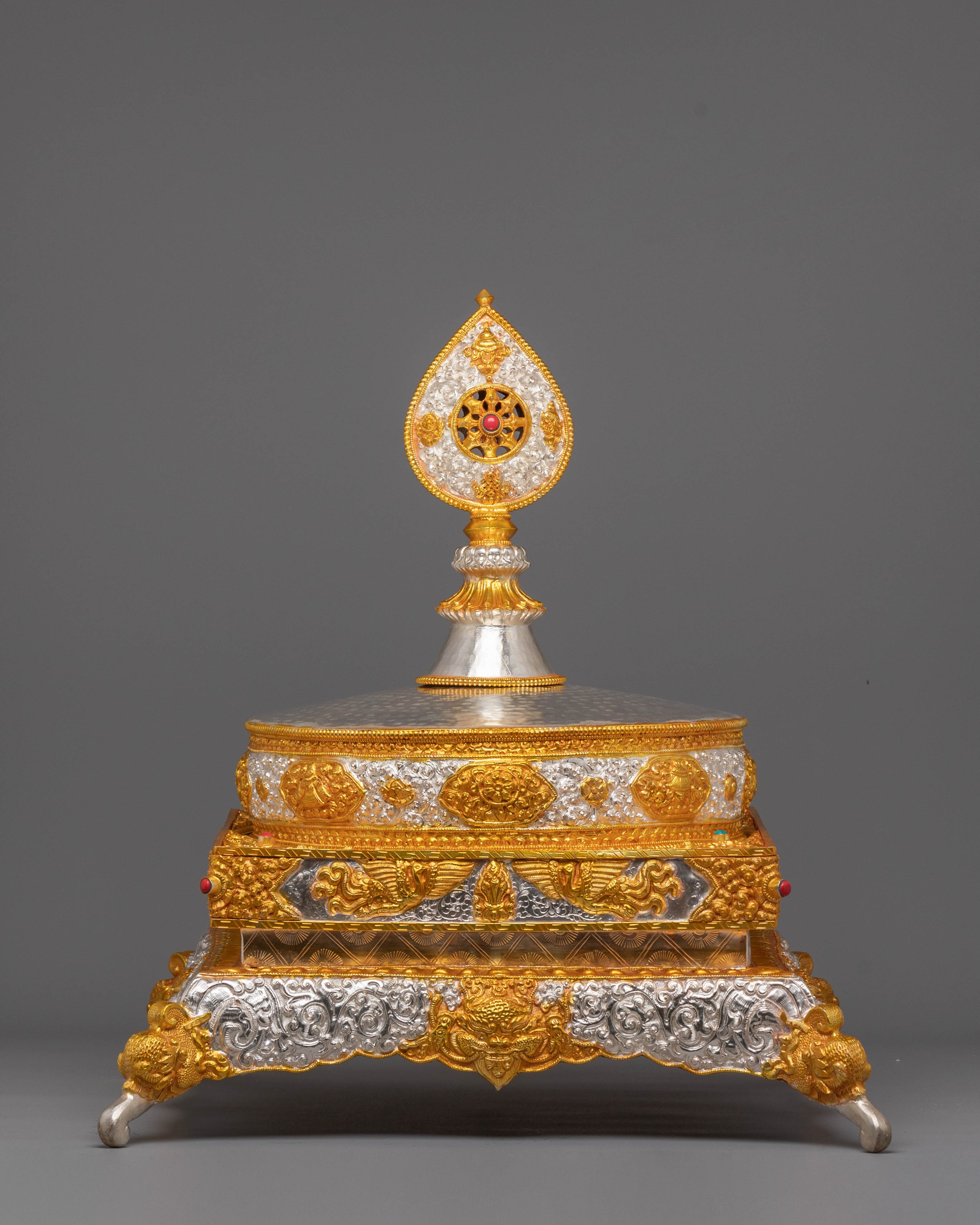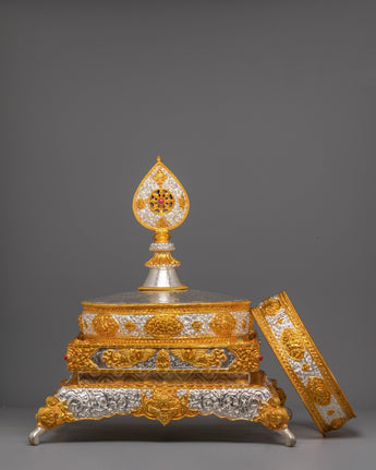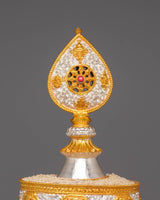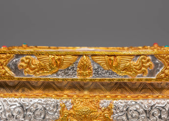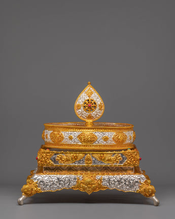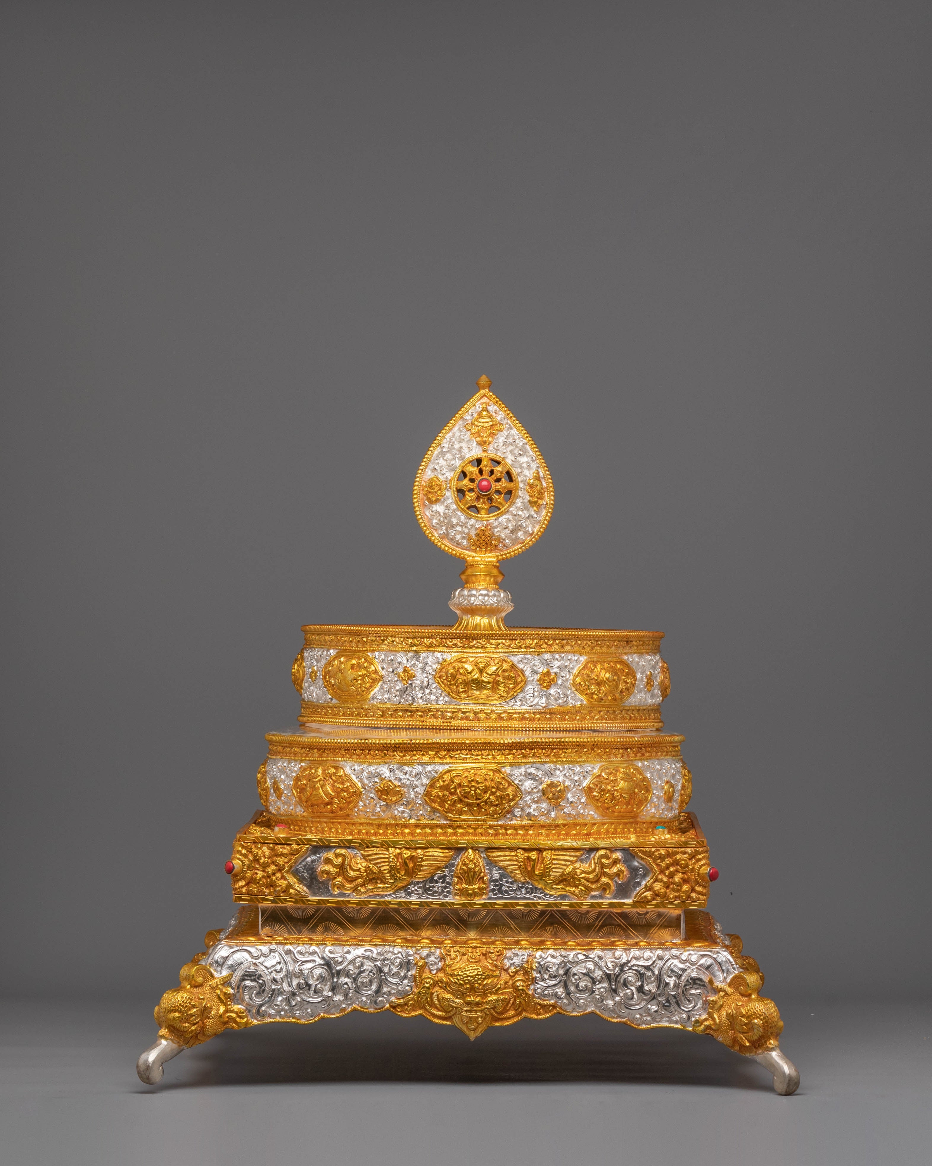 The multi-layered pattern of this mandala represents the journey of spiritual awakening, with each level symbolizing a different stage of enlightenment. The gold-plated layers reflect purity and heavenly light, whereas the silver-plated parts promote clarity and balance. Coral and turquoise stones represent vitality, protection, and spiritual clarity. The elaborate workmanship around the base and above the mandala's crown exemplifies traditional Tibetan craftsmanship, adding spiritual vitality and artistic depth to any area.