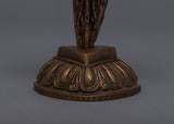 The Phurba, also known as a ritual dagger, is currently placed in a stand for display. The Phurba is a sacred object used in Tibetan Buddhism as a ritual tool for consecration and purification ceremonies. At the top of the Phurba, there is a carved deity that holds great spiritual significance in Buddhist culture. The deity represents a particular aspect of enlightenment and is believed to provide protection and guidance to those who use the Phurba in their spiritual practices. The stand serves not only as a display for the Phurba but also as a place to keep the object safe and secure
