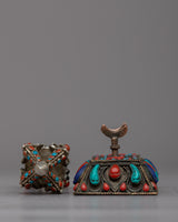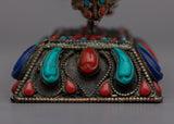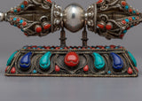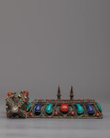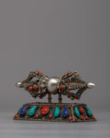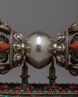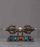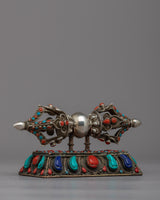 Enjoy this Handcrafted Silver Vajra Thunderbolt's breathtaking beauty! This exquisite piece, which was carefully made with love and skill, exudes strength and mystique. A mesmerizing display of color and radiance is produced by the meticulously embedded gemstones that adorn the Vajra's shimmering silver body. This Vajra oozes reverence and sacredness thanks to its fine craftsmanship and intricate details. Additionally, you can display this magnificent artifact in all its glory with the included stand. This Handcrafted Silver Vajra Thunderbolt is a true treasure that connects you to the depths of spiritual wisdom and enlightenment. Permit yourself to be enchanted by the divine energy and symbolism embodied in it.