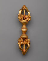 The Vajra art piece is a handcrafted item with a copper body that has been adorned with a water-gold oxidized finish. The Vajra, also known as a Dorje, is a sacred symbol in Buddhism and represents the indestructible and thunderbolt-like qualities of enlightenment. The handcrafted copper body showcases intricate details and craftsmanship, capturing the essence of the Vajra's symbolism. The water gold oxidized finish adds a touch of elegance and antiquity to the art piece, enhancing its aesthetic appeal. The Vajra art serves as a meaningful and revered representation of spiritual strength, wisdom, and the enlightened mind.