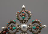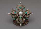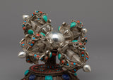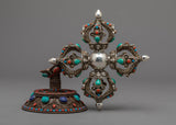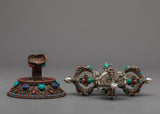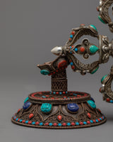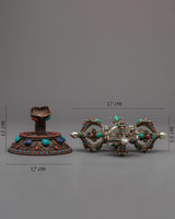 The Bishwo Vajra Dorje with Stand is a meticulously handcrafted piece made from copper, adorned with embedded gemstones, and finished with silver plating. The Bishwo Vajra Dorje, also known as the Double Vajra, is a powerful symbol in Tibetan Buddhism representing indestructibility and enlightenment. The intricate craftsmanship of the copper body and the embedded gemstones enhance the beauty and spiritual significance of the Vajra. The accompanying stand provides stability and serves as a display base for this sacred artifact. This exquisite piece is not only a visual delight but also a meaningful spiritual object for meditation, ritual, and prayer.