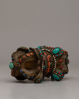 In Buddhist ceremonies, this Vajra Dorje is an effective implement that represents the qualities of a thunderbolt (irresistible force) and a diamond (indestructibility). This artwork is incredibly beautiful and has profound symbolic meaning due to the mix of the inlaid stones' rich hues and sparkling purity. It is the perfect spiritual tool for ceremonial and meditation use, assisting practitioners in focusing their intentions and energies in a visually striking way.