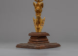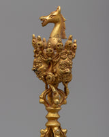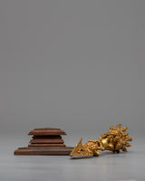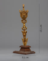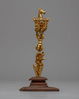 The Vajra Dorje Phurba is a spiritual dagger used in traditional Tibetan rituals. This phurba is handcrafted on a copper body with 24k gold plating, making it a work of beauty. The three-sided blade of the phurba depicts cutting through the three poisons of ignorance, attachment, and aversion. The phurba's crown is ornamented with a wrathful deity face. The stand allows the phurba to be exhibited vertically, making it ideal for altar use or ornamental purposes. The Vajra Dorje Phurba is a potent spiritual practice tool that is highly regarded in Tibetan culture.