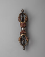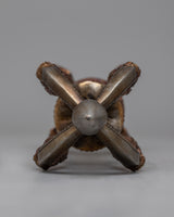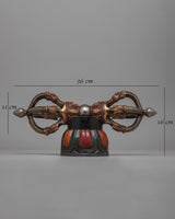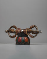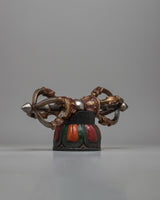 The Vajra with Wooden Stand is a stunning combination of traditional craftsmanship and artistic expression, skillfully created from copper and iron. This sacred emblem has detailed craftsmanship and is decorated with acrylic paint, which adds brightness and depth to its appearance. The vajra is displayed on a wooden stand, which adds to its symbolic value.