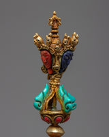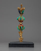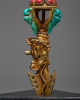 This Phurba, which is supported by a finely carved wooden base, is a tribute to the artist's talent and commitment to upholding the traditions of sacred art. The Phurba's golden sheen and multicolored inlays are complemented by the wooden stand, which not only adds stability and elegance but also strikes a harmonious balance between earthy warmth and heavenly radiance.