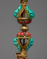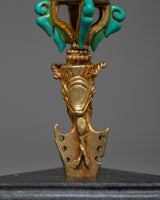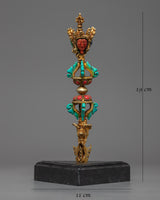 The Wooden Stand Phurba, which is crafted with a copper body and lavishly plated in 24k gold, is a magnificent combination of traditional craftsmanship and spiritual symbolism. The exquisite piece is further embellished with carefully inlaid turquoise and coral stones, which give it an even more striking appearance with vibrant color and depth.