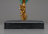 Material: Copper Body, 24k Gold Plated, Coral, Turquoise, Wooden Base