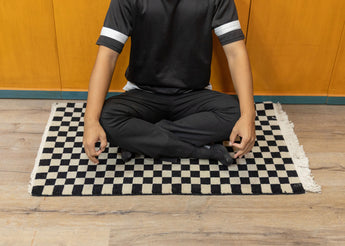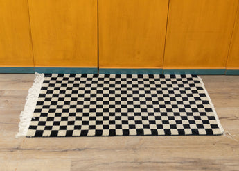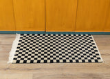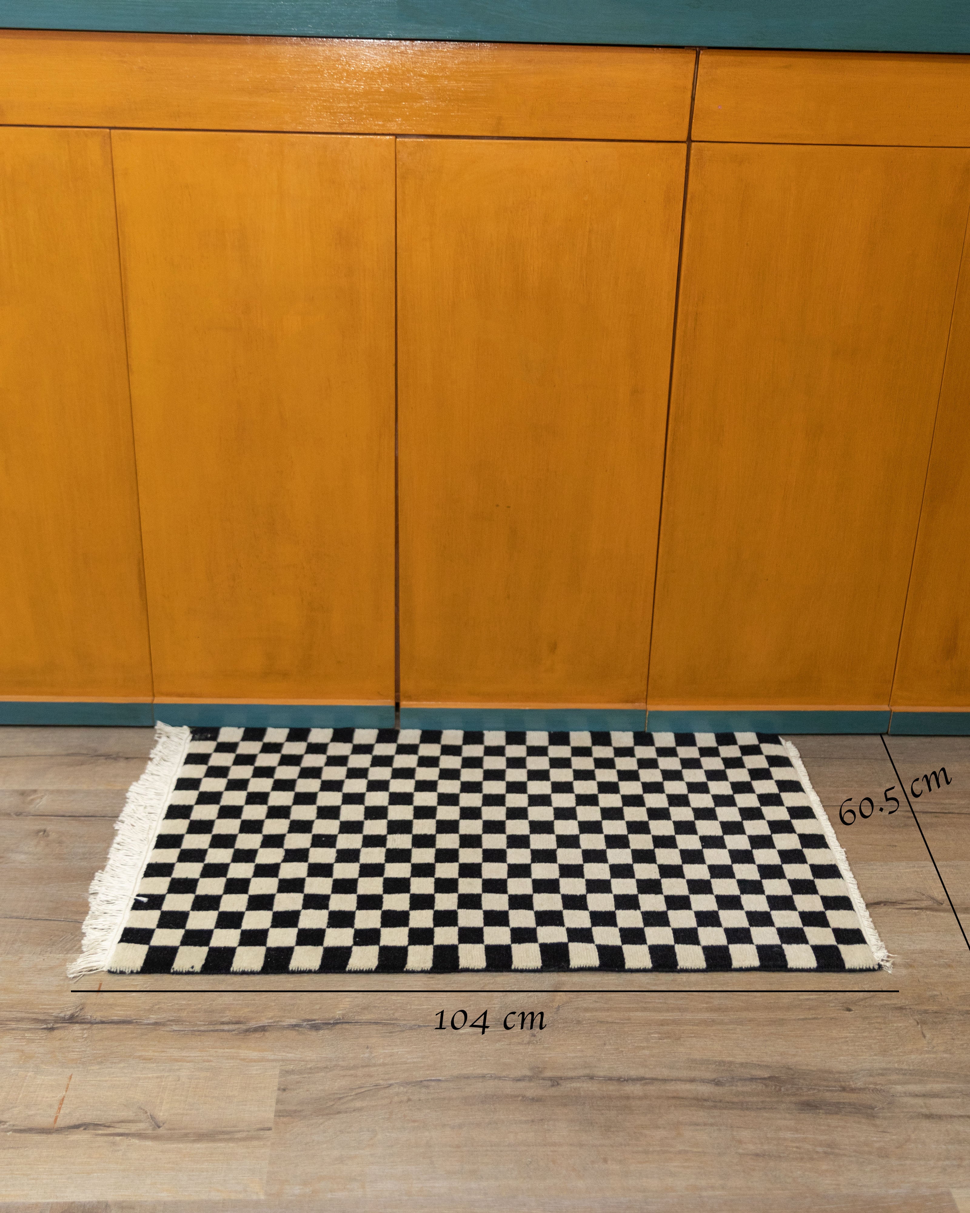 This Traditional Himalayan Rug is an excellent example of Tibetan creativity, combining elegance in a handwoven masterpiece. This rug measures 60.5cm in height and 104cm in width, and is made of wool with a 100-knot weave. It features a classic black and white checkered pattern that exudes simplicity, harmony, and balance. Each knot is precisely woven by expert Himalayan weavers, resulting in strength, longevity, and a soft, sensuous texture underfoot. The intricate craftsmanship reflects Tibet's rich weaving heritage.