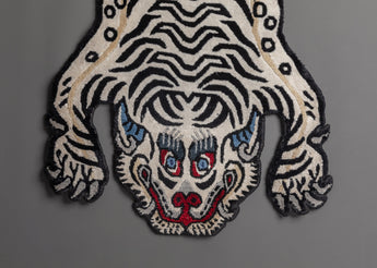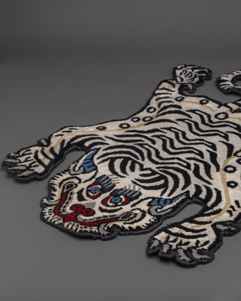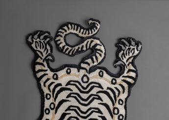 Enhance your home with the spiritual elegance of this Handmade White & Black Tiger Knotted Rug. Drawing inspiration from Tibetan artistry, it showcases a one-of-a-kind and significant addition to any home, meditation, or yoga room. This rug, made of 100% Tibetan and New Zealand wool, uses elaborate knotting techniques to enhance the tiger's royal presence. The tiger, a sign of power, confidence, and disciplined alertness, is frequently connected with the element air and acts as a guardian in Tibetan culture. Its forceful but peaceful attitude instills confidence and helps to eliminate negativity from the atmosphere. The striking black and white contrast not only captivates the eye but also carries deep spiritual meaning.