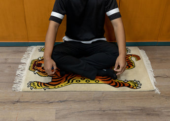 Transform your living space with the Tibetan Tiger Rug, a hand-knotted wool rug that combines artistry with function. This striking carpet features the iconic tiger motif, showcasing vivid stripes against a sun-washed background, instantly elevating the ambiance of any room. Beyond its visual appeal, the rug offers warmth and comforting protection underfoot, making it ideal for meditation corners, yoga areas, or cozy reading nooks. Its bold design also complements modern boho décor, infusing your space with energized charm and cultural richness. Own a rug that speaks to both style and soul.