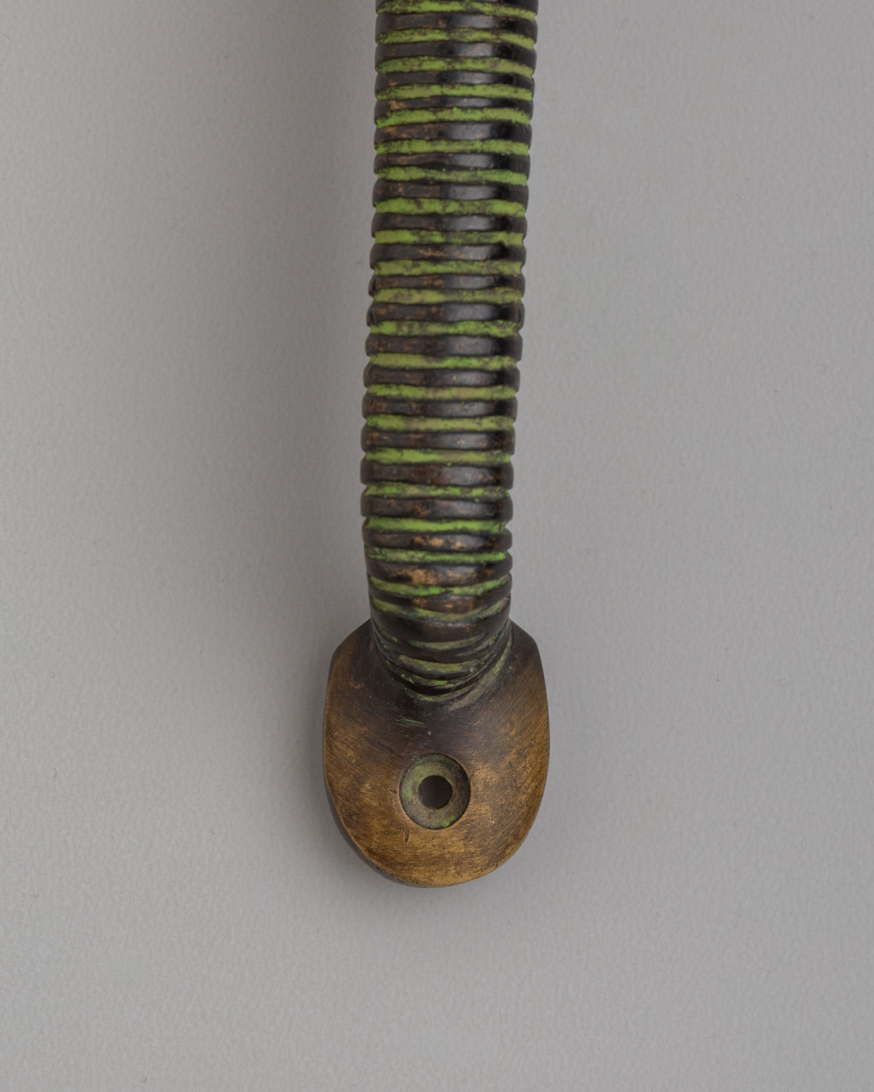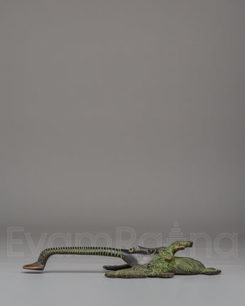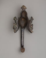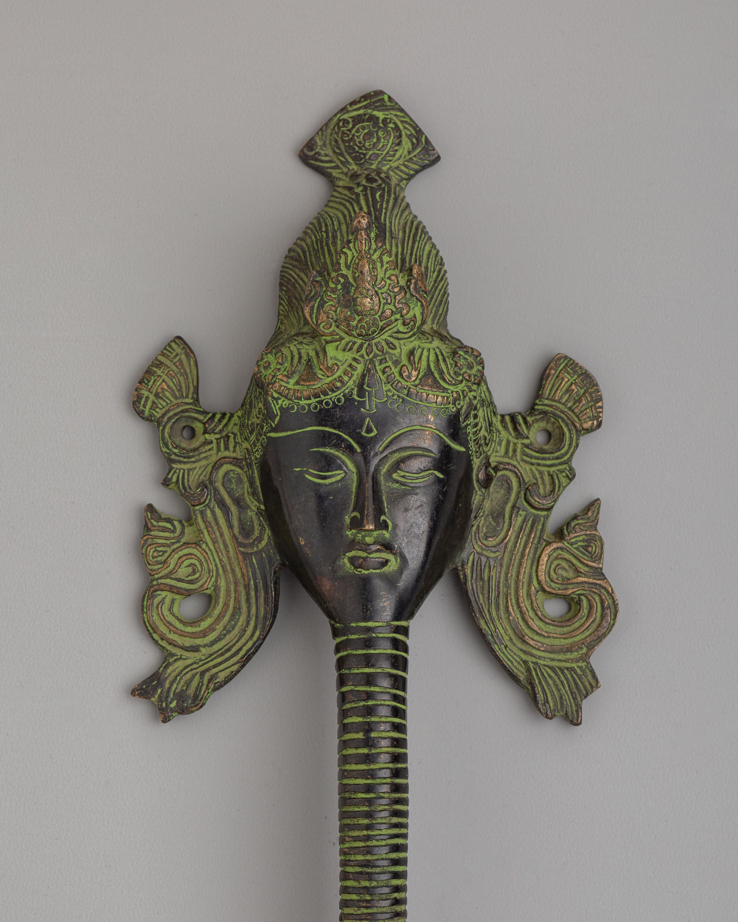 This traditional Buddhist door handle features a serene deity’s face intricately crafted with flowing ornamental details symbolizing wisdom, compassion, and spiritual peace. The calm expression invites mindfulness and tranquility, while the decorative side motifs represent purity and transformation, blessing your doorway with harmony and protection. Made from metal with a natural green patina, the elongated textured handle provides a comfortable grip and adds authentic spiritual charm, making it a meaningful and elegant accent for meditation rooms, temples, or sacred home spaces.