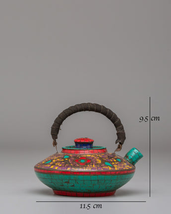 This exquisite teapot is a perfect blend of craftsmanship and spiritual symbolism, featuring a unique combination of copper, coral red stone, lapis lazuli, and turquoise. Standing at 9.5 cm in height and 11.5 cm in width, this tea pot is not only functional but also a statement piece for your tea ceremonies or home decor. The combination of rich copper tones with the vibrant accents of coral red stone, lapis lazuli, and turquoise creates an appealing design, making this teapot an exceptional addition to any collection.