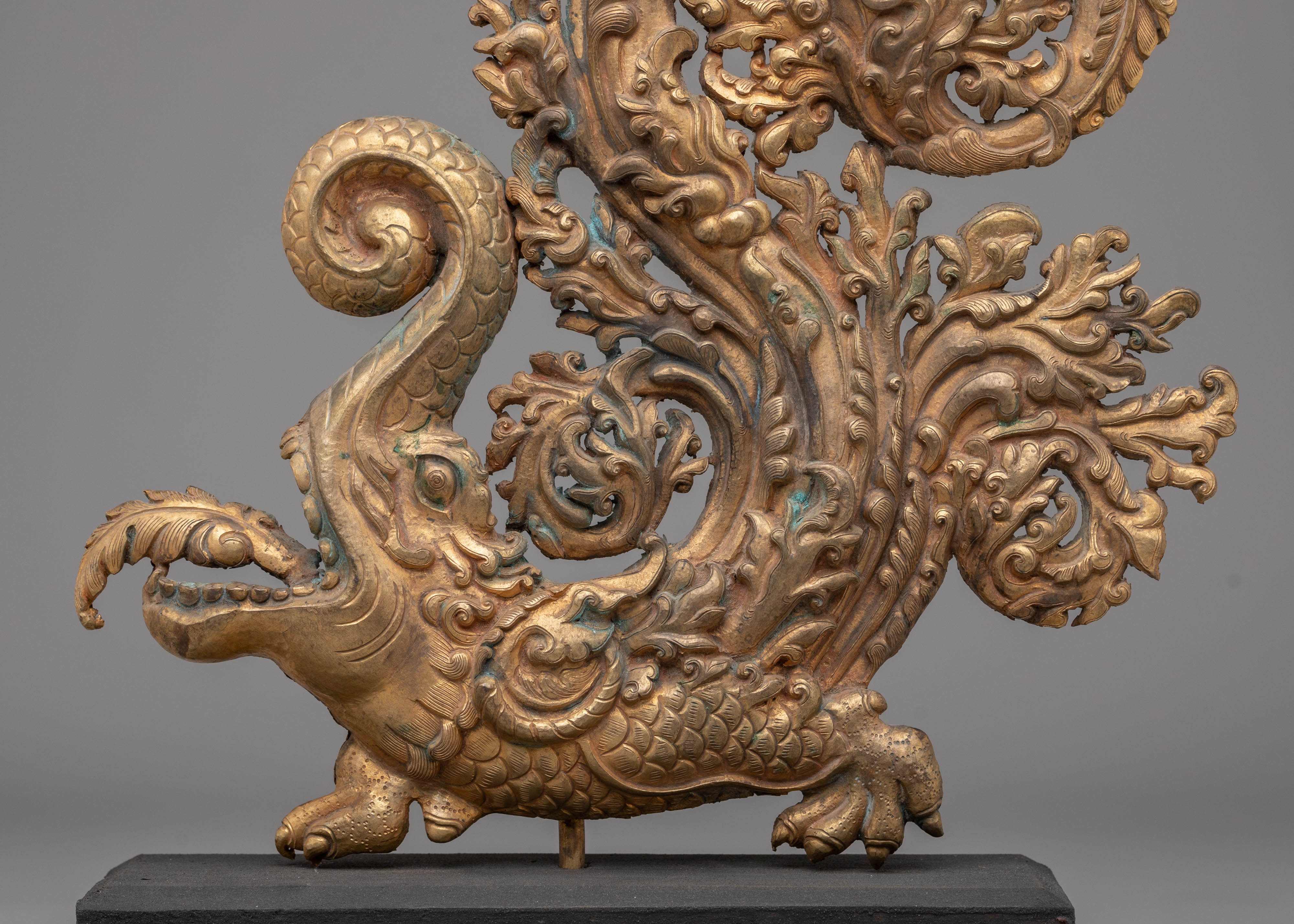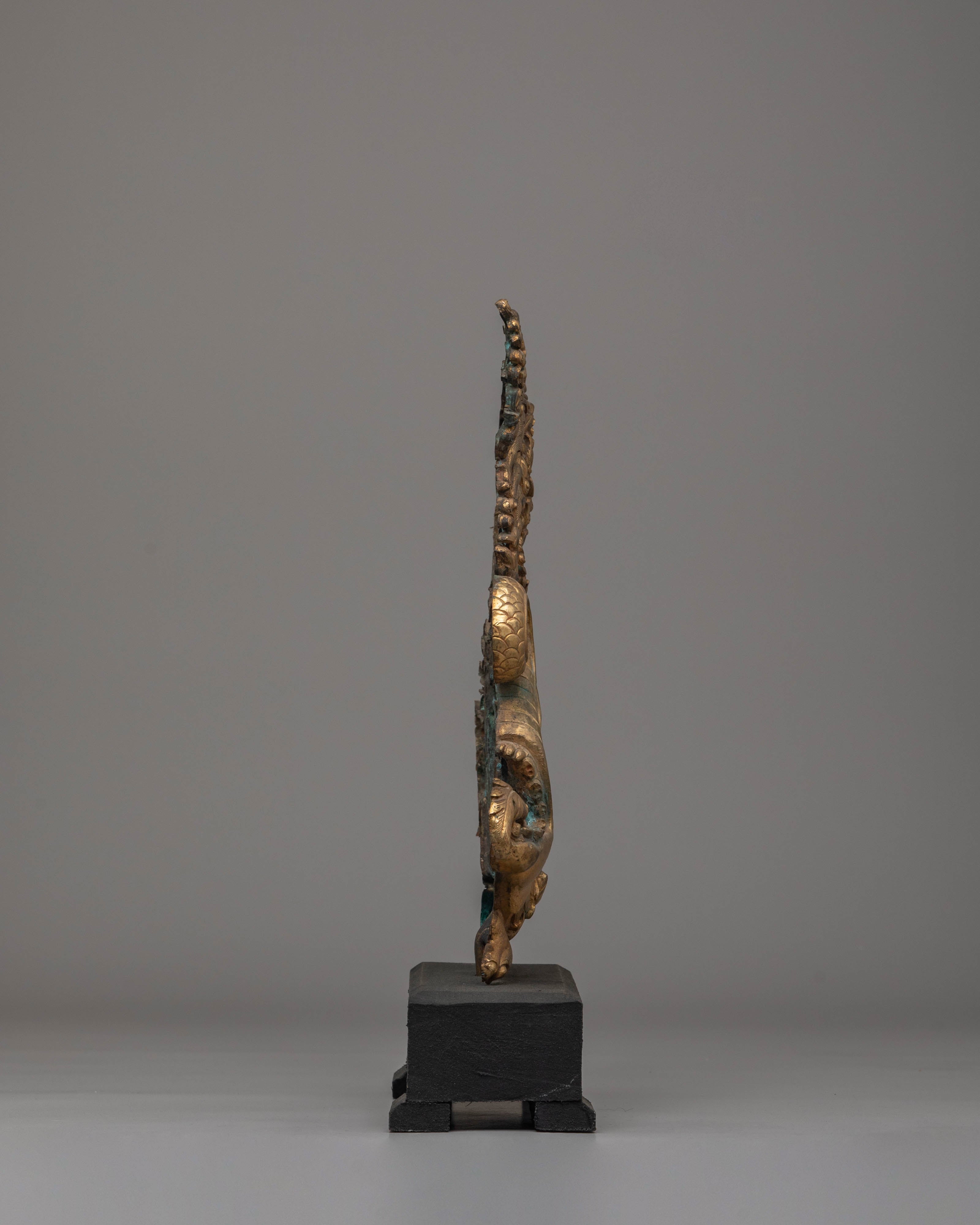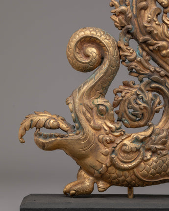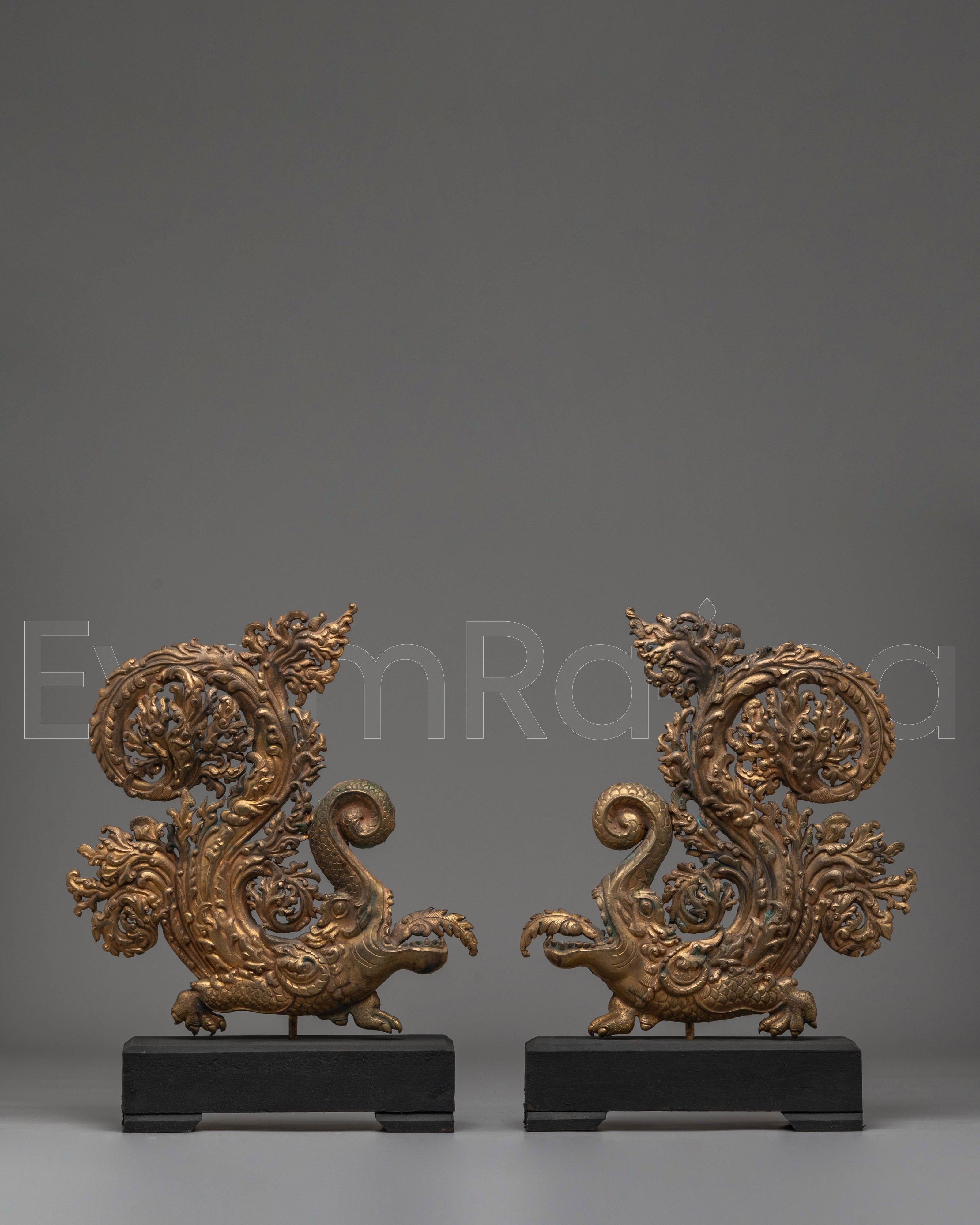 In many different civilizations, makara are highly symbolic of bravery, strength, and good fortune. makara are adored as celestial beings that symbolize the elemental elements of nature and the wisdom of the cosmos in many Eastern faiths, including Tibetan Buddhism. They inspire feelings of grandeur and heavenly presence because they are keepers of treasures and emblems of imperial power. These already magnificent sculptures are made even more stunning by the gold plating, which enhances both their visual appeal and spiritual resonance.