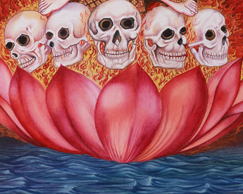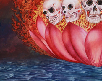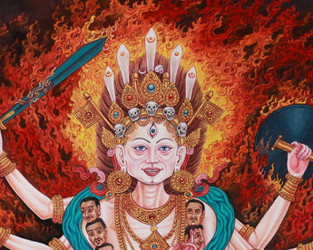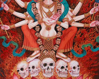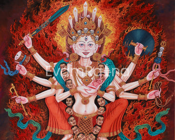 Goddess Chamunda, the Hindu goddess of destruction, is powerfully and vividly depicted in this Giclee canvas print. She is adored for her role in war, plagues, and calamities. Known by several names, such as Chamundeshwari and Chamundi, she represents the harmony between annihilation and rebirth and frequently invoked during chaotic and difficult times. Squatting on five skulls, Chamunda is depicted in this classic image in one of her terrifying and macabre forms, signifying the purifying of the soul and the destruction of the ego.