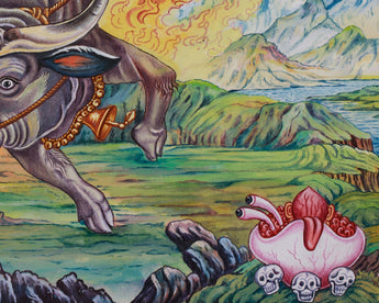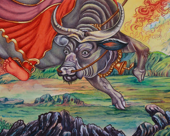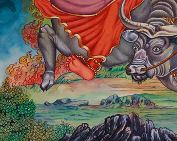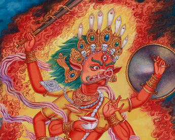 Discover the powerful presence of the Varahi Thangka Print, a divine depiction of the fierce boar-faced goddess known for her ability to protect and transform. It is printed on high-quality Giclee cotton canvas that showcases her ferocious energy and spiritual authority in Newari-style art. Varahi is seated on a bull, representing earthly strength, while her boar face symbolizes her primal power. She is depicted with six hands, each holding a unique symbol reflecting her spiritual influence. A sword, cutting through ignorance and delusion, a shield, purifying suffering into wisdom. Another hand raises in the abhaya mudra, offering fearlessness and protection. A goad, representing control over desires and the ability to direct spiritual energy, and a lasso wrap around the bull, symbolizing spiritual control over earthly desires.
