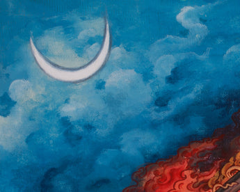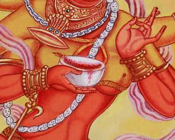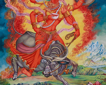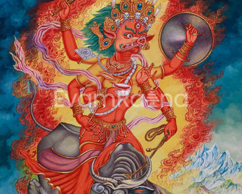 The Varahi Thangka Print is a powerful representation of the goddess, symbolizing her red form, strength, and transformation. The bull beneath her represents strength and vitality, while the fiery background symbolizes her role as a destroyer of obstacles. The moon above her symbolizes clarity and feminine energy. The Thangka also features representations of the Five Senses, emphasizing the importance of mindful awareness in spiritual practice. These figures encourage deep self-awareness and wisdom, aligning with higher spiritual truths. Surrounded by celestial elements and traditional iconography, this artwork blends spiritual depth, Newari-style art, and visual impact. It is a perfect spiritual tool for those seeking empowerment, protection, and spiritual transformation.