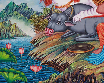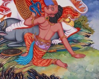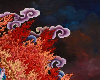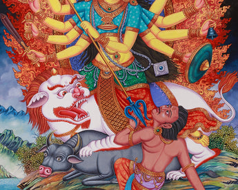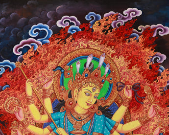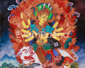 Goddess Bhagwati Thangka print depicts the mighty Hindu goddess Durga, known for her strength, protection, and ultimate victory over evil. Bhagwati, recognized for embodying power, strength, and feminine energy, is depicted in a dynamic pose surrounded by a halo of flames, symbolizing her transformative power. With her many arms wielding sacred weapons, such as the dagger and disc, she conquers the buffalo demon Mahishasura, representing the timeless triumph of good over evil. The lion at her side signifies unwavering courage and divine authority, while the surrounding flames illustrate her powerful transformative energy. This intricate artwork is perfect for meditation, devotion, or as a spiritual decor piece in your sacred space.