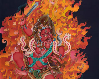We present this Khadgapani Goddess Thangka Print, perfect for an offering to improve your spiritual practice and fill your holy space with protecting energy. The god carrying the sword of wisdom, Khadgapani, protects against hindrances and fearlessly calls for deeper meditation. The canvas material gives it a real feel as the strength and compassion of the goddess are captured in this finely drawn thangka. Let this Thangka Print serve as your visual talisman, providing protection and spiritual strength, whether you place it as the focal point of your room or in your meditation area. Let the guidance of Khadgapani within you promote calmness, concentration, and a spiritual connection.