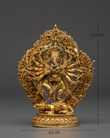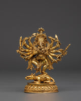 Invoke heavenly protection and strong blessings with this 12-Armed Ganesh Gold-Plated Copper Statue, which depicts Lord Ganesha in his active form. Standing 12cm tall and 9.5cm broad, this religious sculpture depicts Ganesha with twelve limbs, each carrying a symbolic weapon or object, representing his supreme command over barriers, evil forces, and spiritual problems.