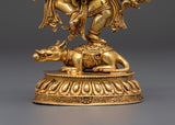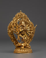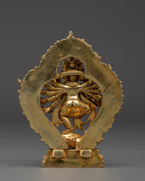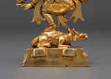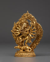 This statue, expertly machined from a copper body with gold plating, is a remarkable example of spiritual workmanship. Every detail, from the furious but collected countenance to the finely carved arms and elaborate backdrop, is intended to imbue your meditation room or shrine with heavenly energy. The base has a classic lotus pedestal, and Ganesha stands dominantly over a symbolic mouse and opponent, demonstrating his cosmic dominion.