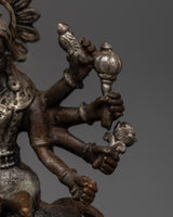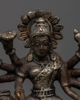 Presenting the exquisitely carved Durga Puja Statue, which is plated in silver and is made of oxidized copper. This little statue, which is only 6 cm tall, is a representation of the powerful and protective Hindu goddess Durga. The statue has an elegant, antique appearance thanks to the silver plating, which highlights the fine details of her many arms, each of which is holding a symbolic weapon, against the wonderfully textured backdrop of oxidized copper.