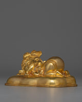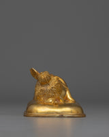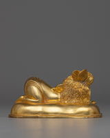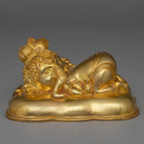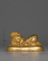 This stunning statue of Lord Ganesha, made of copper and delicately plated in gold, exudes divine grace and serenity. The statue depicts Ganesha in a tranquil, resting beliefs, lying down with one hand on his cheek and the other tenderly grasping his symbolic object. The delicate features on his face, from his relaxing look to his intricately carved head of hair, highlight the craftsmanship that completed this artwork. Every curve and fold of his body has been painstakingly crafted to reflect the appreciated deity's serene and compassion character.