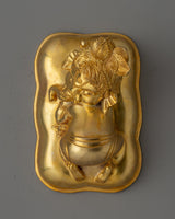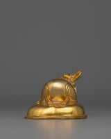 This Ganesha statue is smaller but impactful, measuring 7 cm in height and 13.5 cm in width, making it outstanding for compact altars, tabletops, or display shelves. Considering its size, it weighs 0.67 kg, giving the item an authoritative feel and emphasizing its craftsmanship. The gold plating adds to the statue's richness, giving it a brilliant and sumptuous finish that elegantly reflects light, making it a remarkable focal point in any room. The delicate details in Ganesha's attire, as well as the smooth contours of his elephant head, contribute to the piece's overall grace.