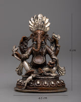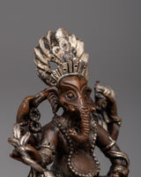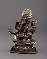 Presenting the magnificent Ganesha Statue, a masterfully sculpted portrayal of the esteemed deity, plated in fine silver and made of oxidized copper. This monument, which stands just 6 cm tall, blends Lord Ganesha's (also known as the remover of obstacles) spiritual symbolism with traditional artistic style.