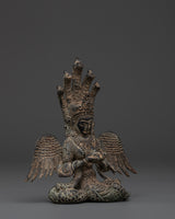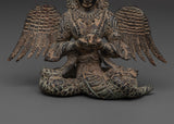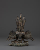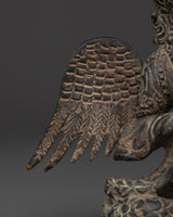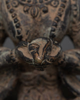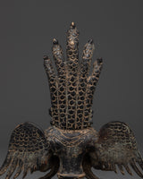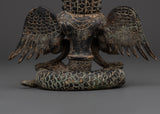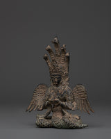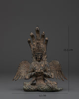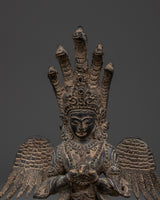 Invite the mystical spirit of the Naagkanya with this exquisite handmade figure, which stands 15.5 cm tall, 13 cm wide, and weighs 0.87 kg. This sculpture, crafted from sturdy copper with an antique finish, depicts the snake goddess in a contemplative seated pose, adorned with elaborate wings and crowned with multiple serpent heads. The ancient patina gives the statue a rich, historic feel, making it both a potent symbol and a stunning ornamental element for any spiritual altar or home meditation room. This statue, made by talented Nepali craftsmen, exemplifies remarkable workmanship with exquisite engravings and a genuine antique polish that heightens its spiritual significance.