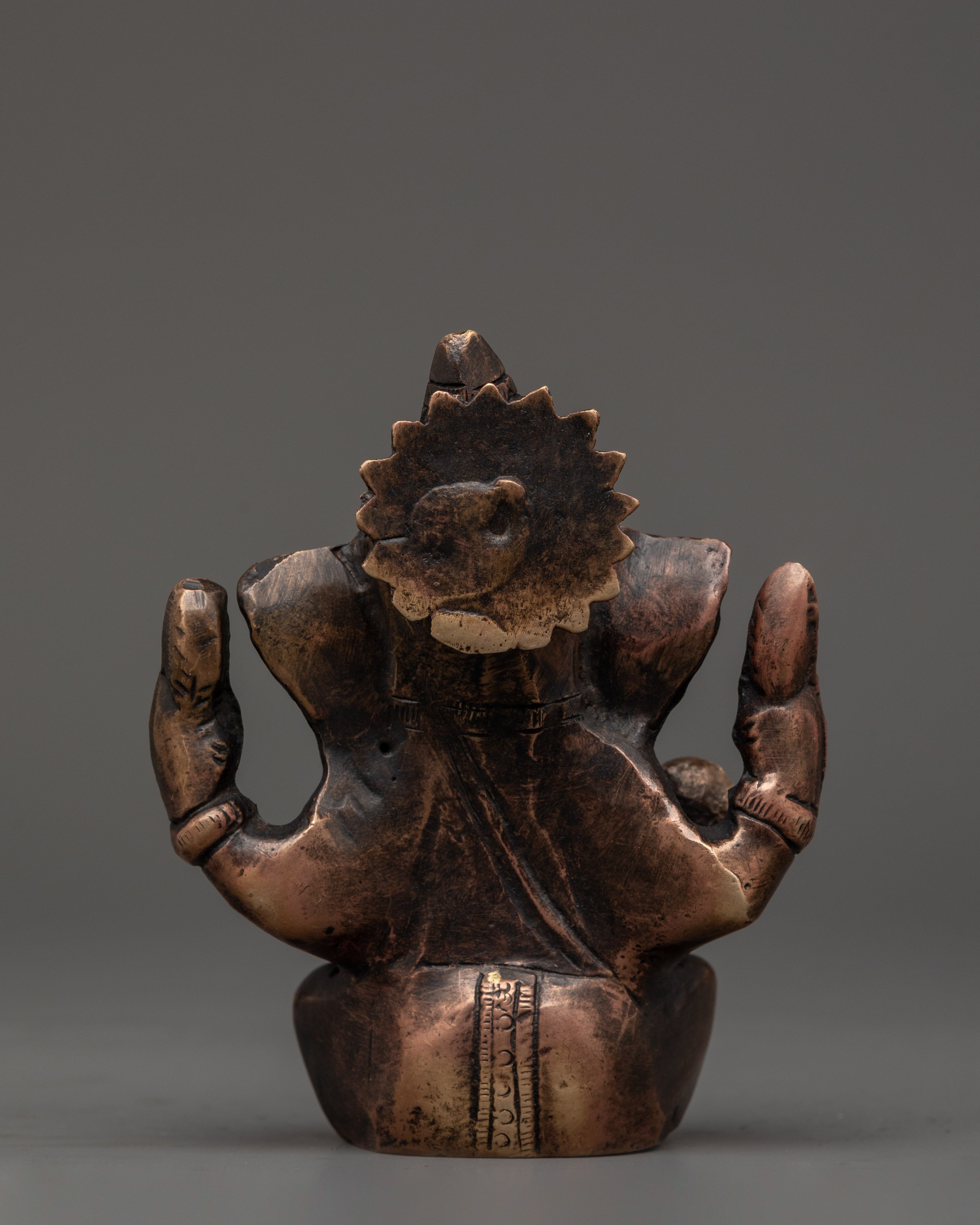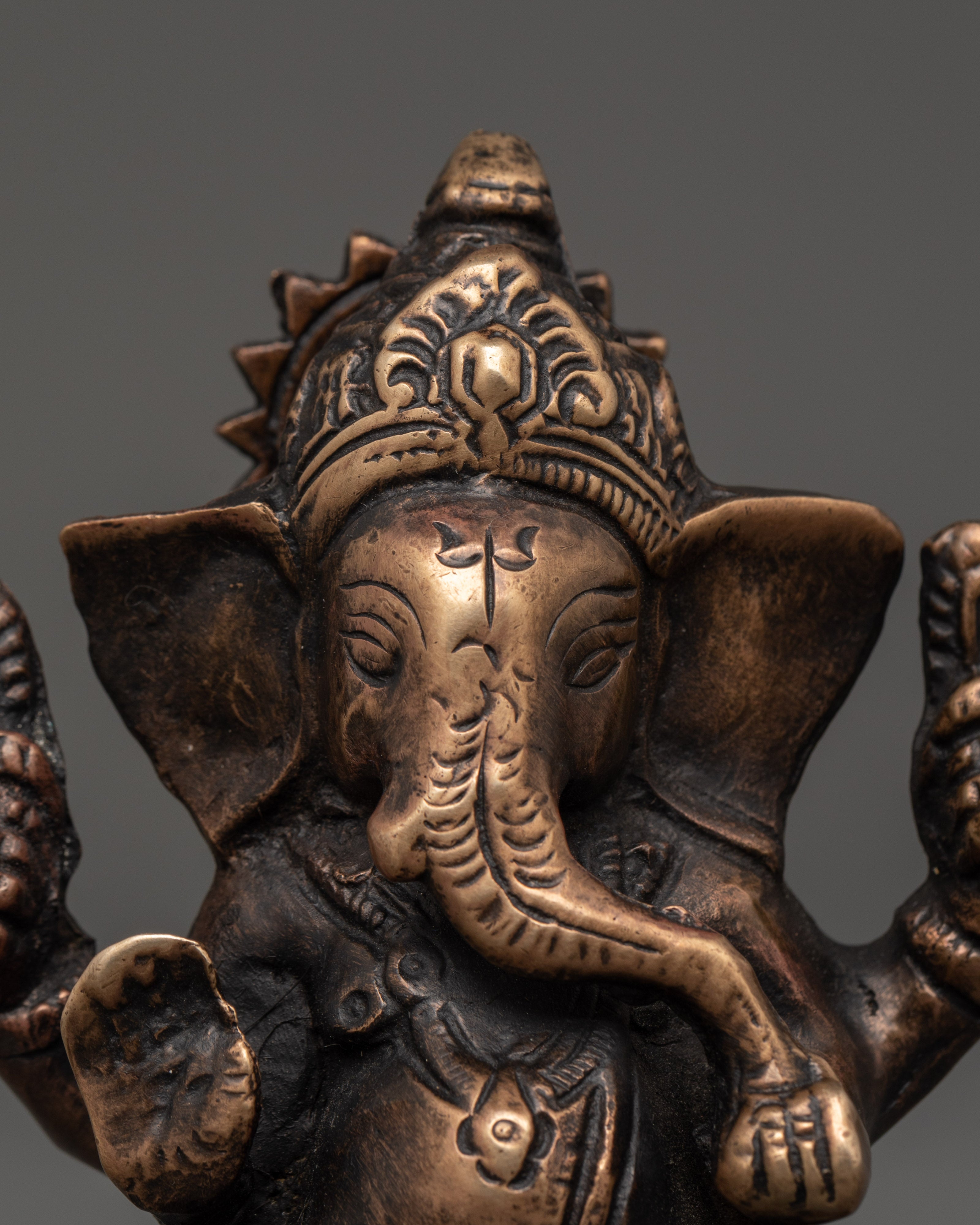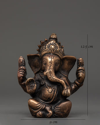 The design highlights Lord Ganesh’s distinct features, including his elephant head, serene facial expression, and multiple arms, each holding symbolic items like a modak (sweet) and a lotus. The detailed brass body accentuates these features, and the traditional attire and crown add to the sculpture's authenticity. The warm, antique bronze finish complements the overall motif, creating an inviting and calming presence in any room.