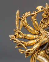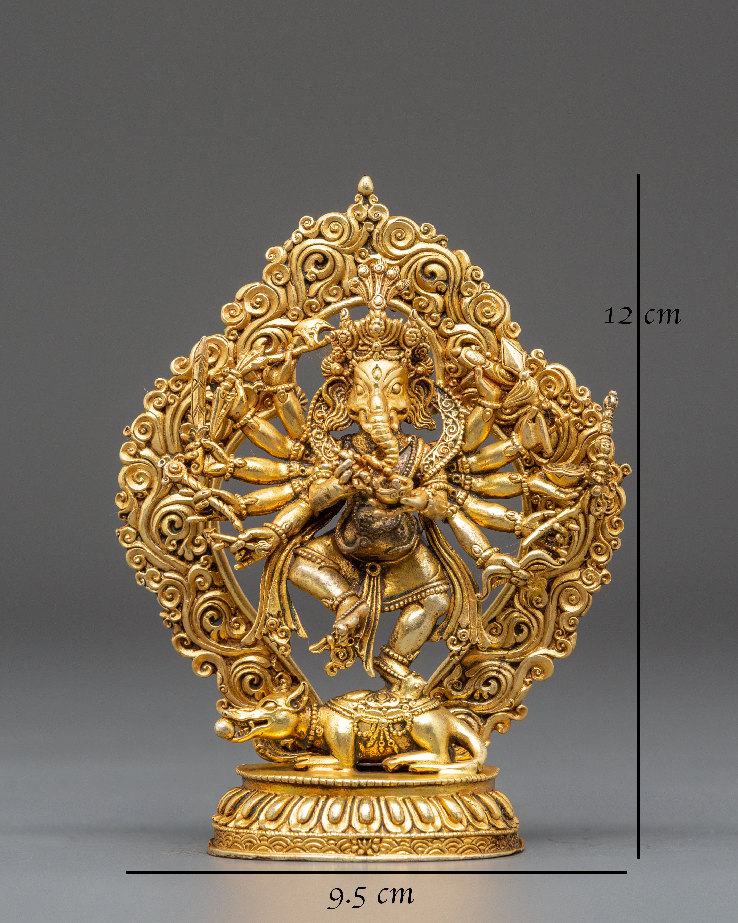 This finely carved Hindu Deity Ganesha Statue depicts Lord Ganesha, the remover of obstacles and the God of Wisdom and Prosperity. This statue, which stands 12cm tall, 9.5cm wide, and weighs 0.25kg, is crafted from copper with a gold-plated finish, adding an attractive, divine touch to your home or altar. Ganesha is a venerated figure in Hinduism, noted for his elephant head and the ability to bring good fortune, eliminate obstacles, and bestow wisdom and success.