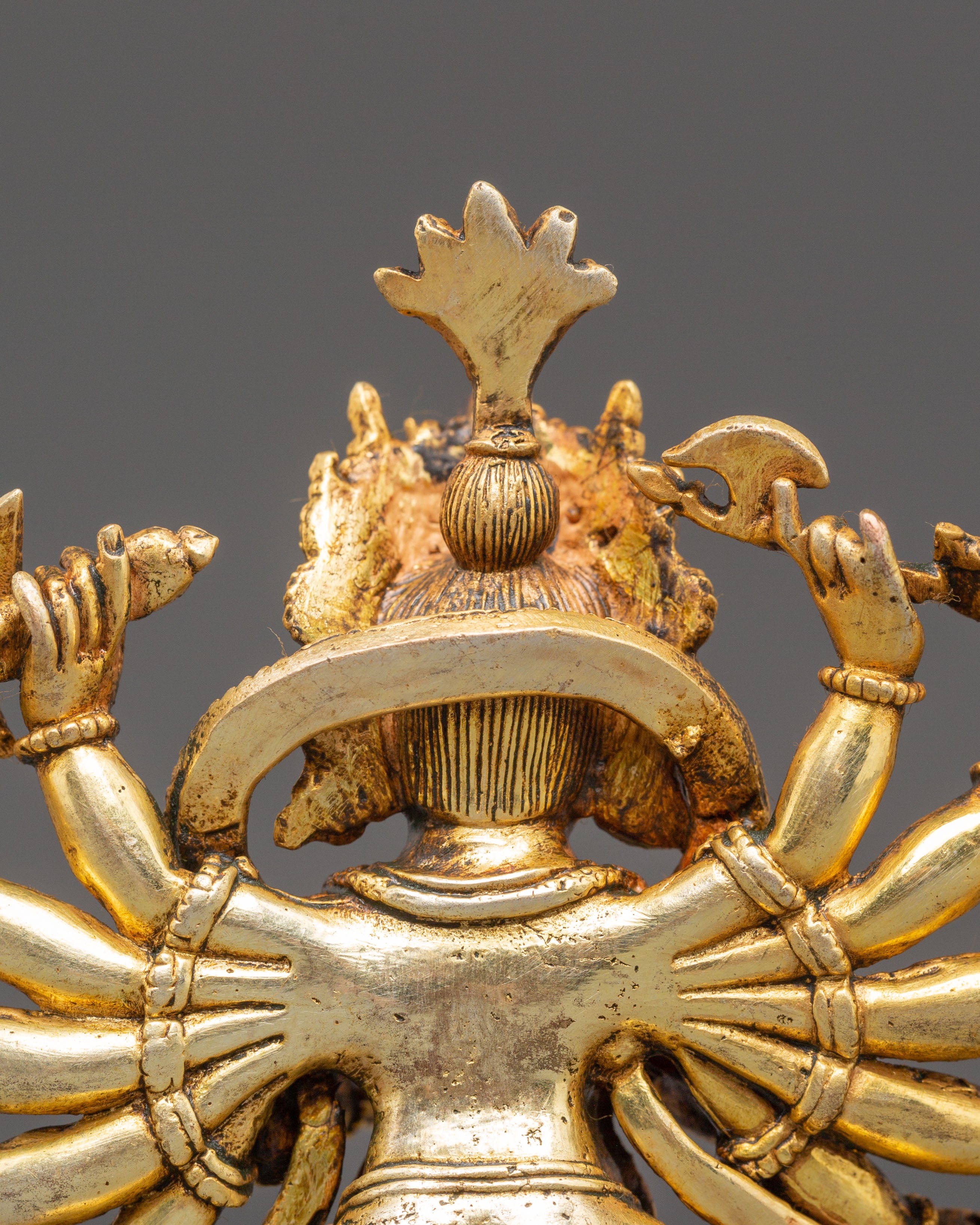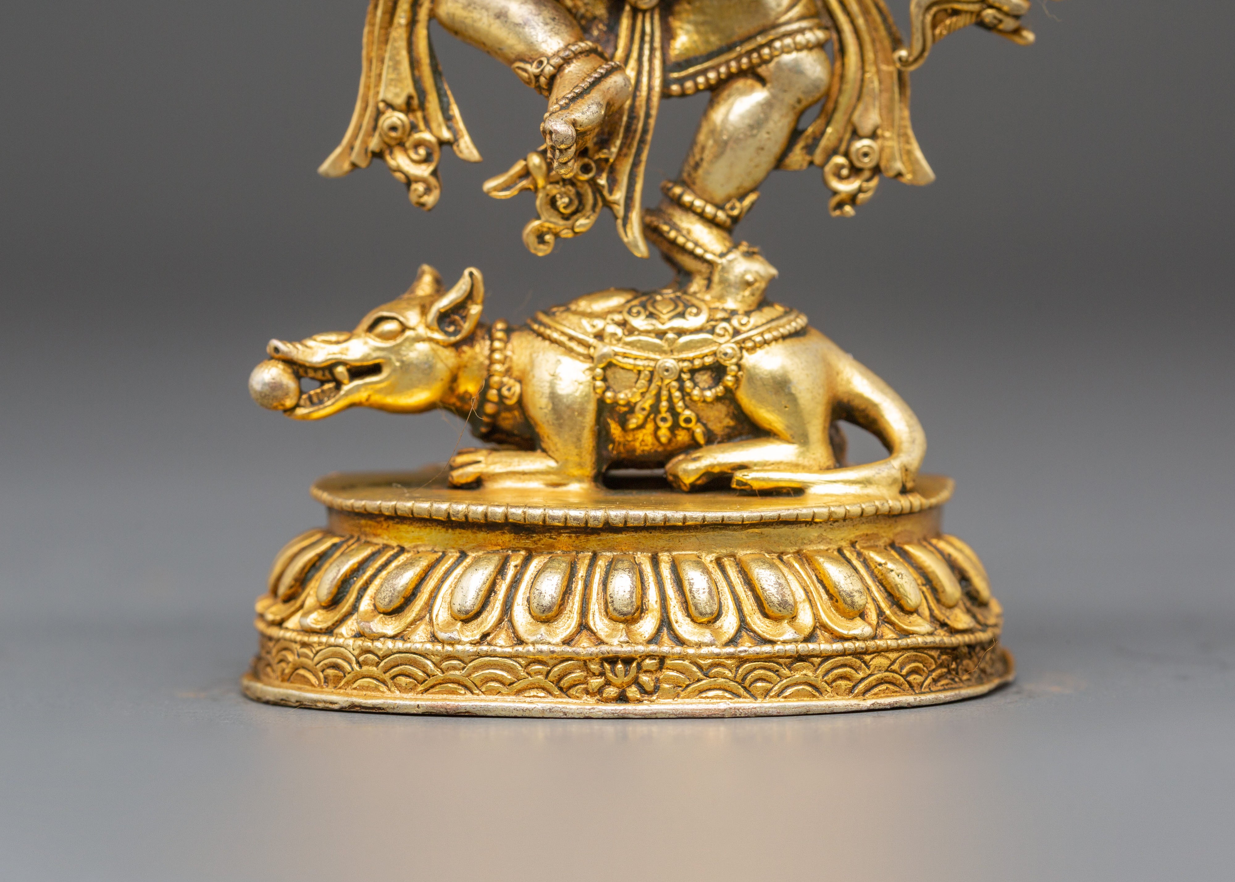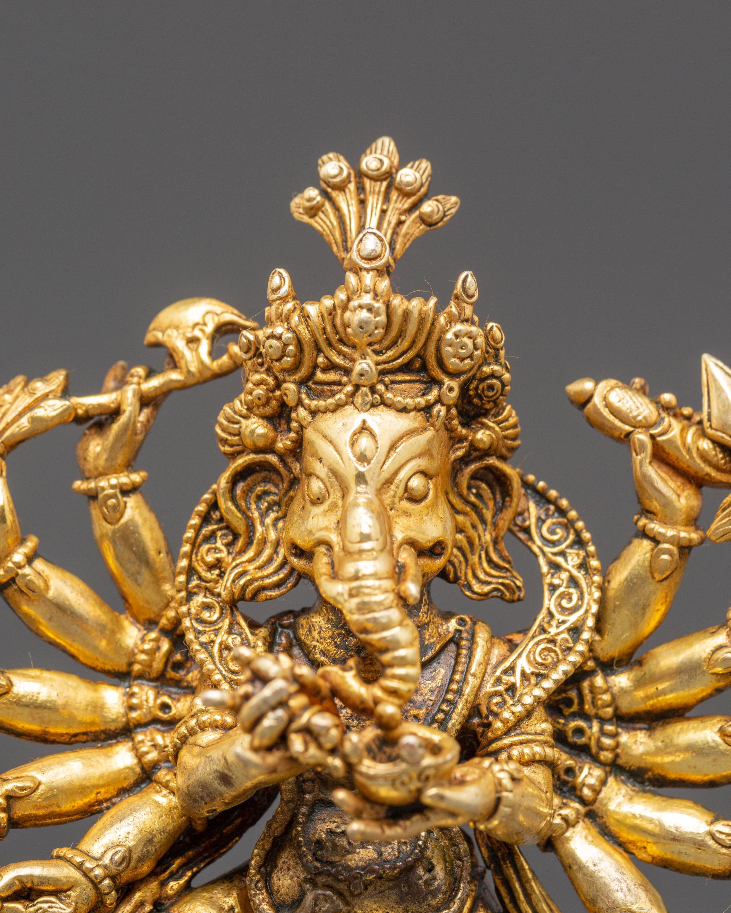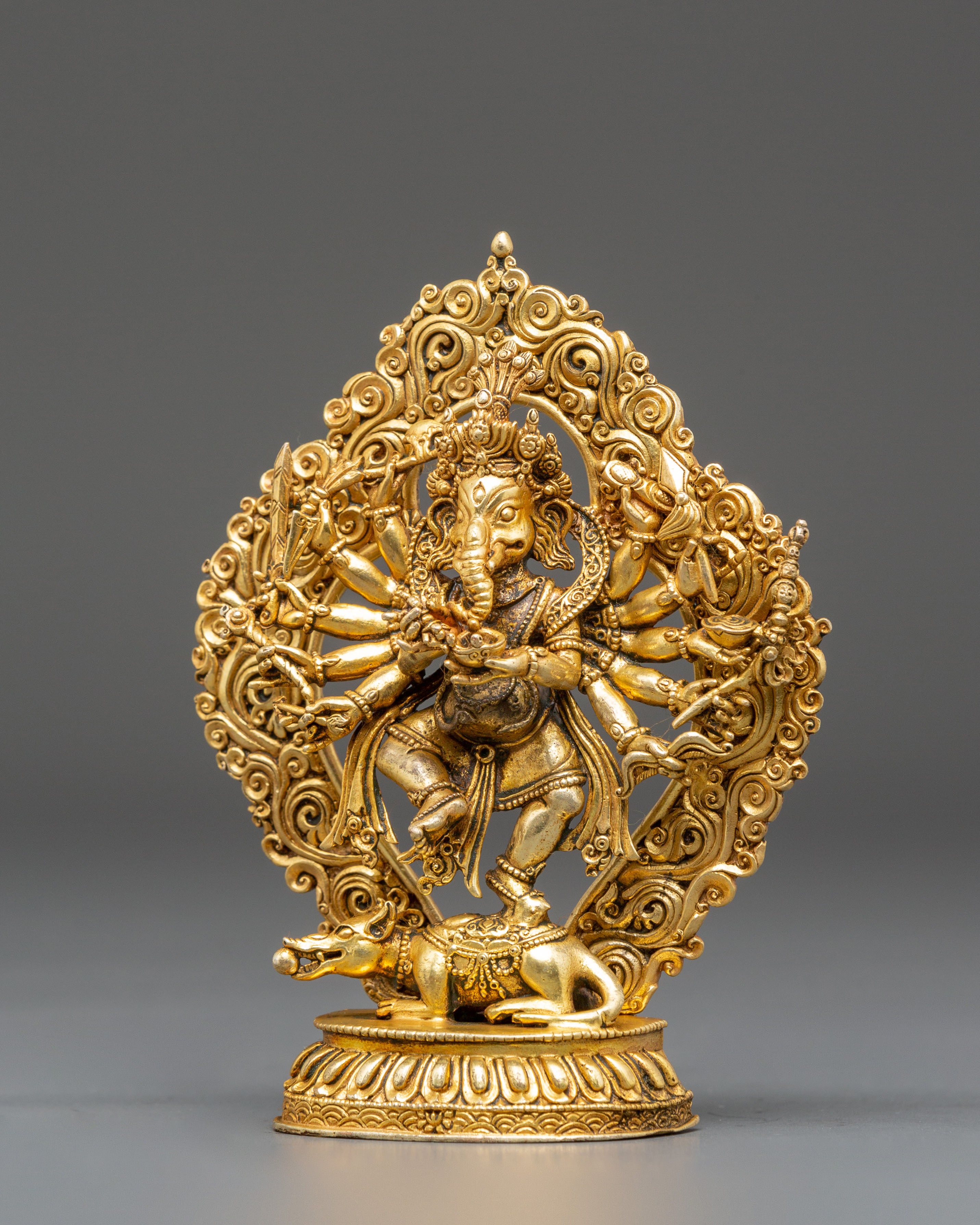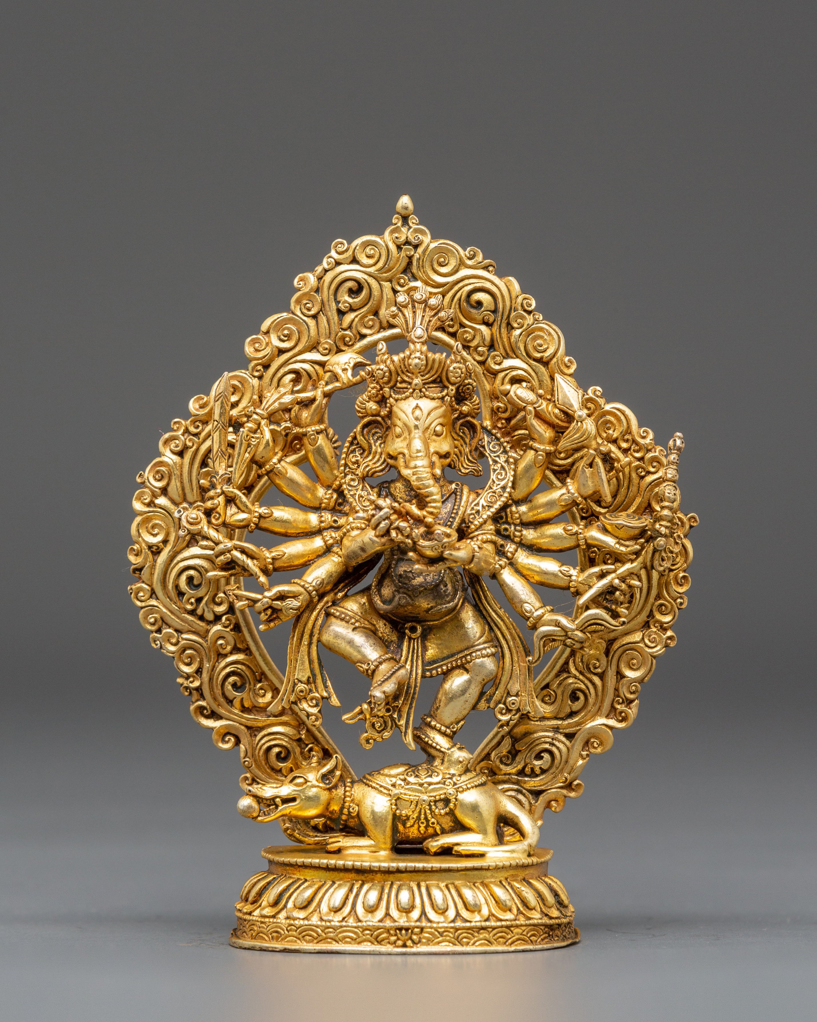 The statue's design features Ganesha's numerous limbs, each holding sacred artifacts that represent his heavenly traits, such as a modak (a sweet) for spiritual knowledge and enjoyment, an axe for cutting attachments, and a lotus for purity and enlightenment. The rich design in the gold-plated torso, particularly the ornate jewelry and crown, adds to the statue's spiritual air. His vehicle, a mouse, is positioned beneath his feet, indicating control over even the smallest aspects of life. Ganesha's powerful stance and graceful posture depict his duty as guardian and mentor to his devotees.