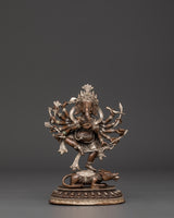 This Hindu Elephant God Ganesha Idol is a handcrafted masterpiece made with an oxidized copper body and silver plating. Measuring 18.5 cm in height and 14 cm in width, and weighing 0.83 kg, it combines devotion with artistry. The antique oxidized surface highlighted with silver details gives the piece a distinctive character, making it ideal for worship spaces, meditation corners, or as a sacred decorative centerpiece.