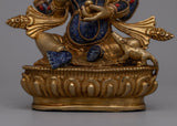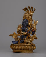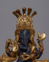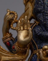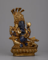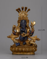 The Lapis Lazuli Ganesha Statue is a magnificent example of creative craftsmanship and Hindu mysticism. This 19.5-cm-tall statue is meticulously made from copper, the foundation material, and is embellished with lapis lazuli, a semi-precious stone prized for its deep blue hue and metaphysical qualities.