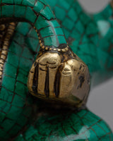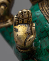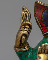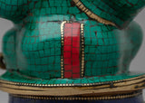 This Lord Ganesha Statue is a lovely and exquisite work of art that has been carved on a brass base. The statue is embellished with gemstones, which add to its attractiveness and aesthetic worth. Lord Ganesha, the remover of obstacles, is represented sitting on a circular pedestal, carrying ritual implements in his four hands. This statue's attention to detail is exceptional, making it an ideal addition to any collection or altar.